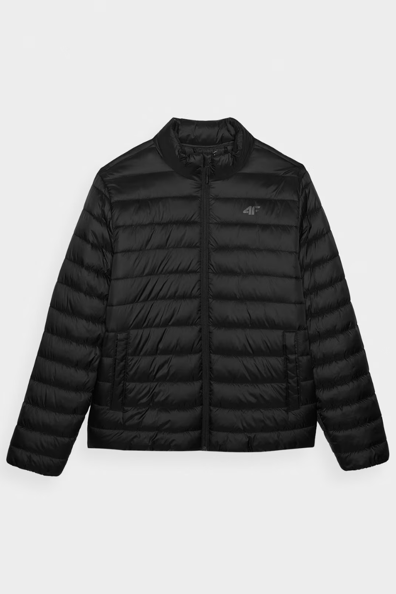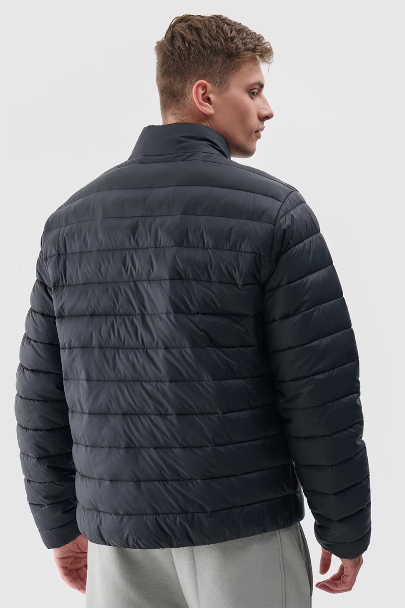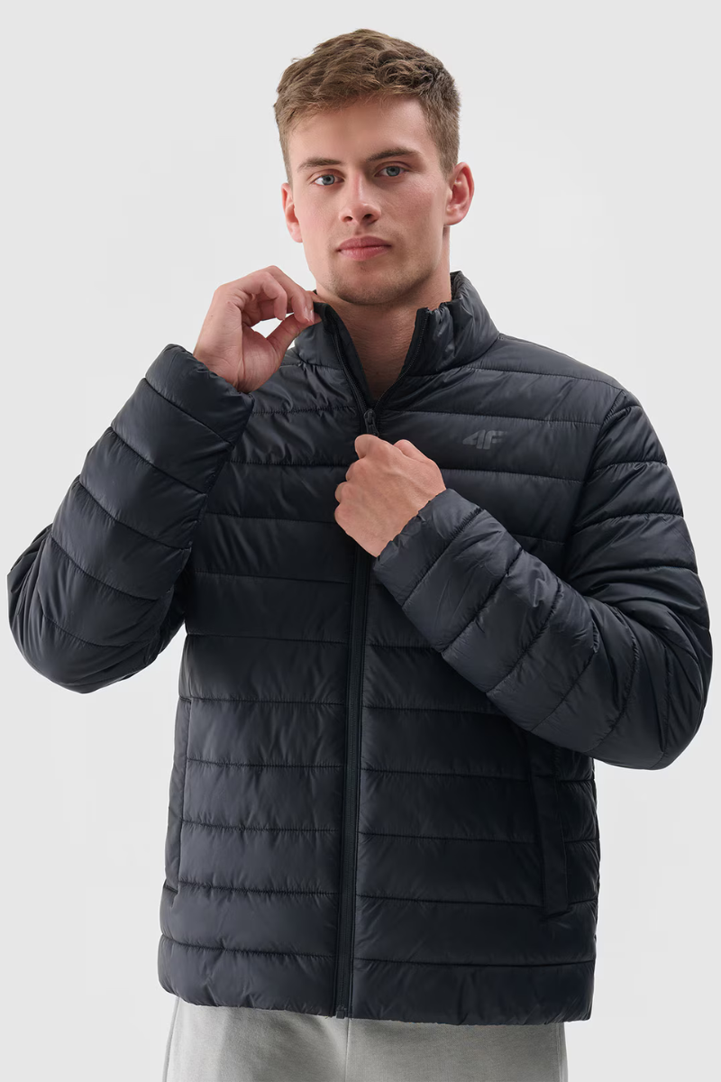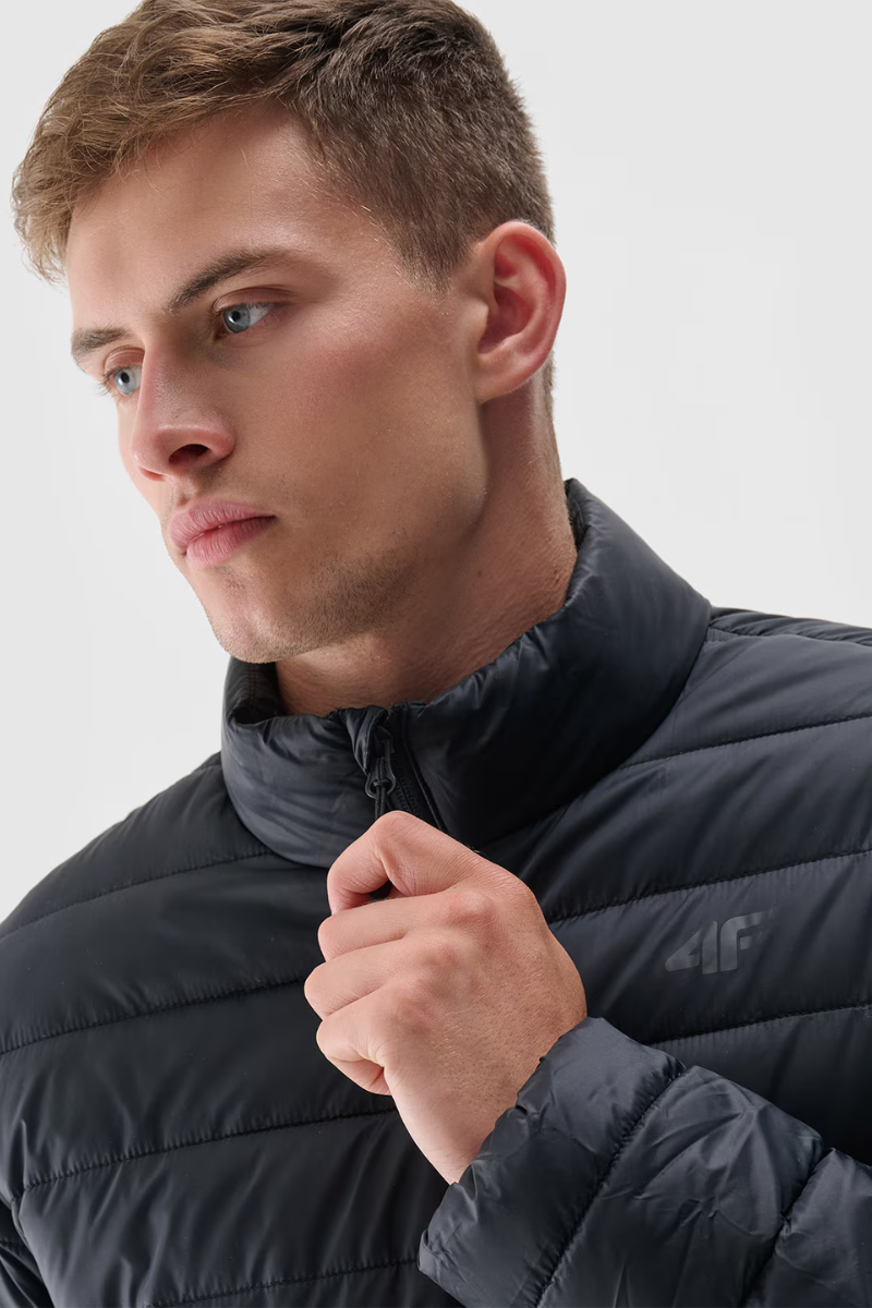 Men's quilted down jacket with filling made of recycled synthetic down. Men's 4F down jacket. The synthetic down filling is more durable and easier to maintain than natural down. Even when in contact with moisture, it retains its insulating properties for a longer time and dries much faster. Additionally, it does not require a complicated washing and drying process. Functional solutions for maximum comfort: hydrophobic impregnation. The hydrophobic impregnation covers the outer layer of the material and protects it from water absorption. The coating causes moisture to condense on the surface of the fabric or knitwear, after which it flows freely away. A low collar protects the neck. The sleeves have cuffs finished with elastic rubber. There are 2 open pockets on the sides. Inside, there is a pocket with a zipper. Main material: 100% polyamide. Lining: 100% polyester. Filling: 100% polyester.