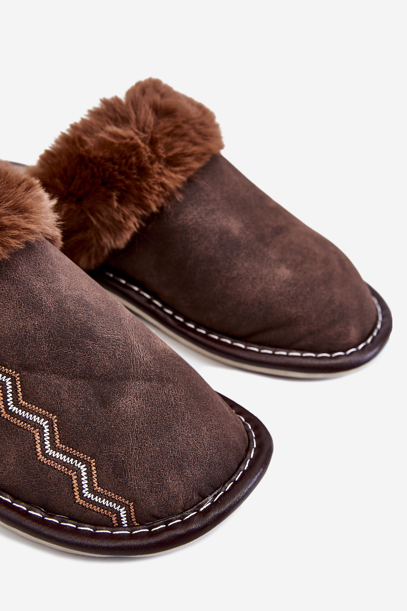 Home men's slippers made of eco leather outside with eco fur trim. The soft insole will ensure comfort during use. It is also insulated. There is irregular, decorative stitching on the front of the slippers. The sole is made of a flexible material that provides flexibility. Perfect for home comfort! When choosing a size, please use the size chart.
