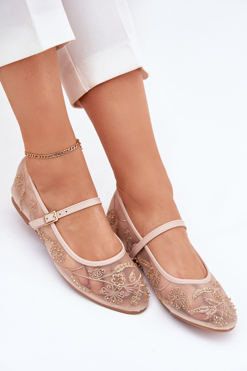Mesh Ballet Flats With Embroidery And Decoration Beige Tillilora