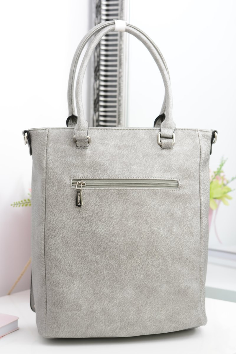 City women's bag, made of eco leather with original texture(35/28/12cm). The bag is suspended on handles, one-compartment, covered with a zipper. The front of the bag is decorated with metal rivets and a jewelry plate with the Monnari brand logo. The bag has a light-colored lining, pockets for wallet and phone, and a pocket on the back for keys and phone. Model available in several color variations.