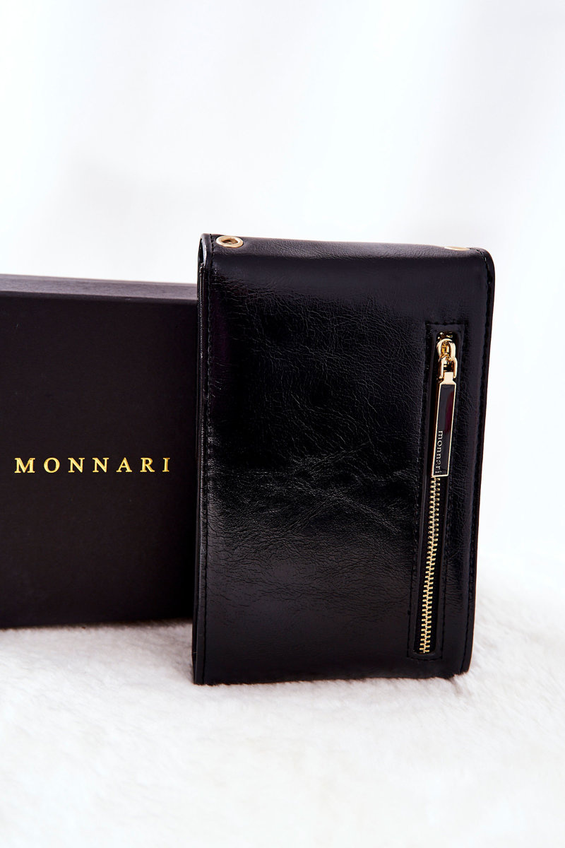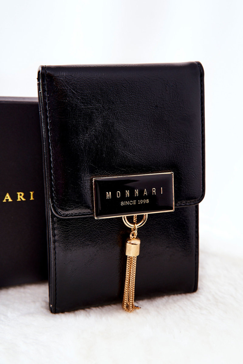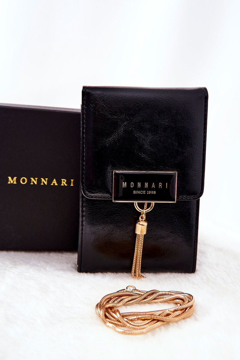 The bag is perfect for when you need to take the most necessary things such as your phone, documents or money. It is fastened with a magnet flap. Inside there are two compartments with additional space for business cards and one open pocket. There is also a zipped pocket on the outside of the bag. Additionally there is a chain attached. On the flap there is a decorative emblem with the Monnari brand logo and a tassel.