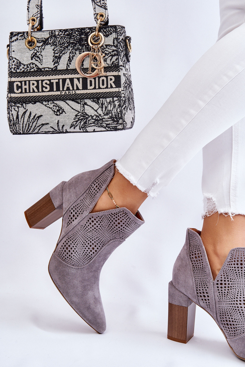 Wonderful, openwork boots with a fashionable heel in the form of a post, made of soft eco suede. The boots have a partial decoration in the form of an openwork pattern. Classic slip-on model. The soft and comfortable insole is made of eco leather. This great model will work in many styles! When choosing a size, please refer to the size chart.