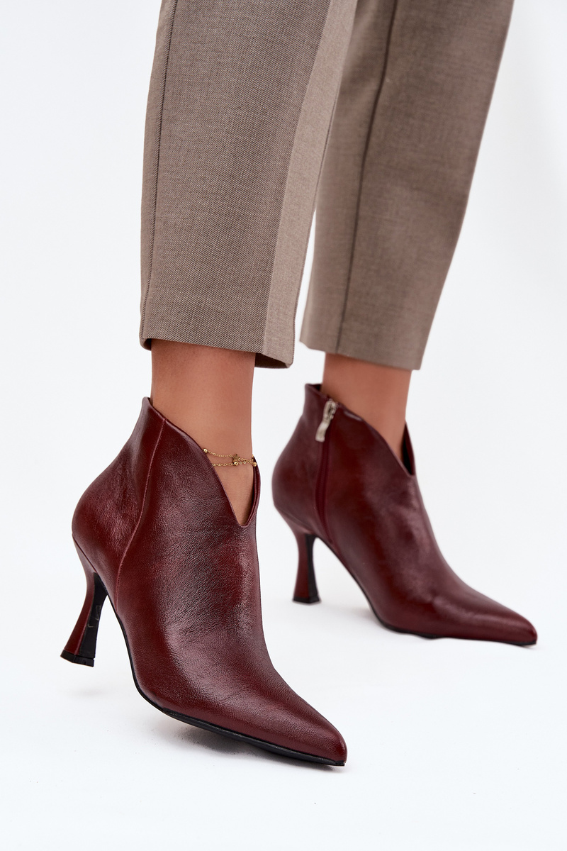 Low women's ankle boots made of eco-leather are an elegant option for women who appreciate classic style with a modern twist. Set on a slender heel that beautifully elongates the silhouette, and with pointed toes that add sophistication and highlight the feminine character of the footwear. The model is fastened with a practical zipper, making it easy to put on and take off. An interesting feature that distinguishes this model is the asymmetric shaft, which gives an original look and makes the shoes exceptionally stylish. An excellent choice for elegant outfits – both for everyday wear and special occasions. Please refer to the size chart when choosing your size. When choosing a size, please refer to the size chart.