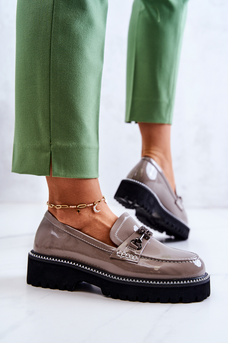 Loafer-style patent leather shoes! Upper ankle. The shoes have a belt on the front with a decorative element. Rounded nose. The sole is made of plastic with a large tread. A flat heel will ensure stability at every step. The insole is made of natural leather and is very comfortable to use. Be sure to check out the other models of shoes available in our offer! When choosing a size, please use the size chart.