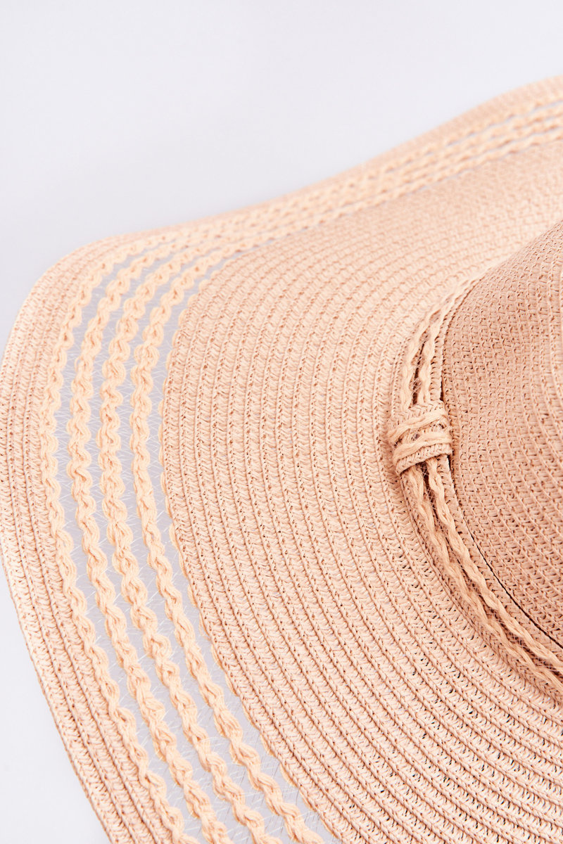 The classic, plain women's hat is made of 100% paper. The roundabout has a translucent pattern. There is a stripe in the color of the hat on the decoration. In addition, there is a ribbon inside that allows you to adjust the hat to the circumference of the head.