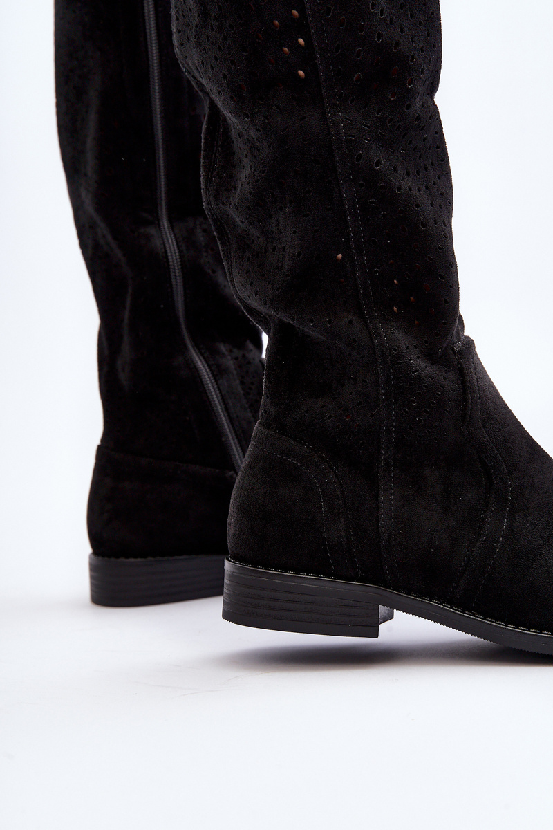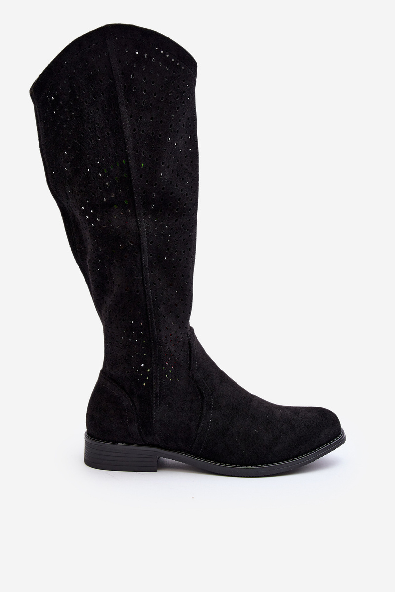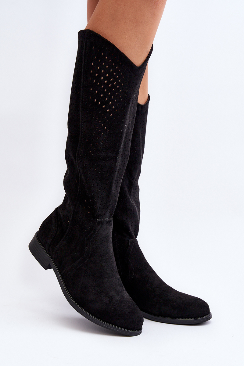 Women's cowboy-style boots. Made of eco-suede. Set on a flat, stable heel. Fastened with a side zip. The model has a latticed upper reaching the knee. Rounded toes. Perfect for many everyday stylings! You definitely should have them in your wardrobe! When choosing a size, please refer to the size chart.