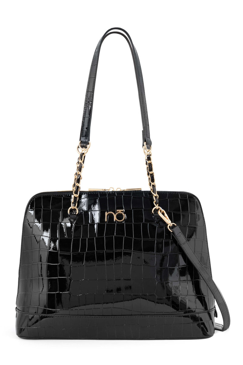 The large shoulder bag is made of 100% polyurethane, and the lining is 100% polyester. The bag has one compartment closed with a zipper, in which there are two open pockets and one closed with a zipper. It has a decorative embossing imitating crocodile skin and a logo on the front. The lacquered material catches the eye and gives it a unique character.