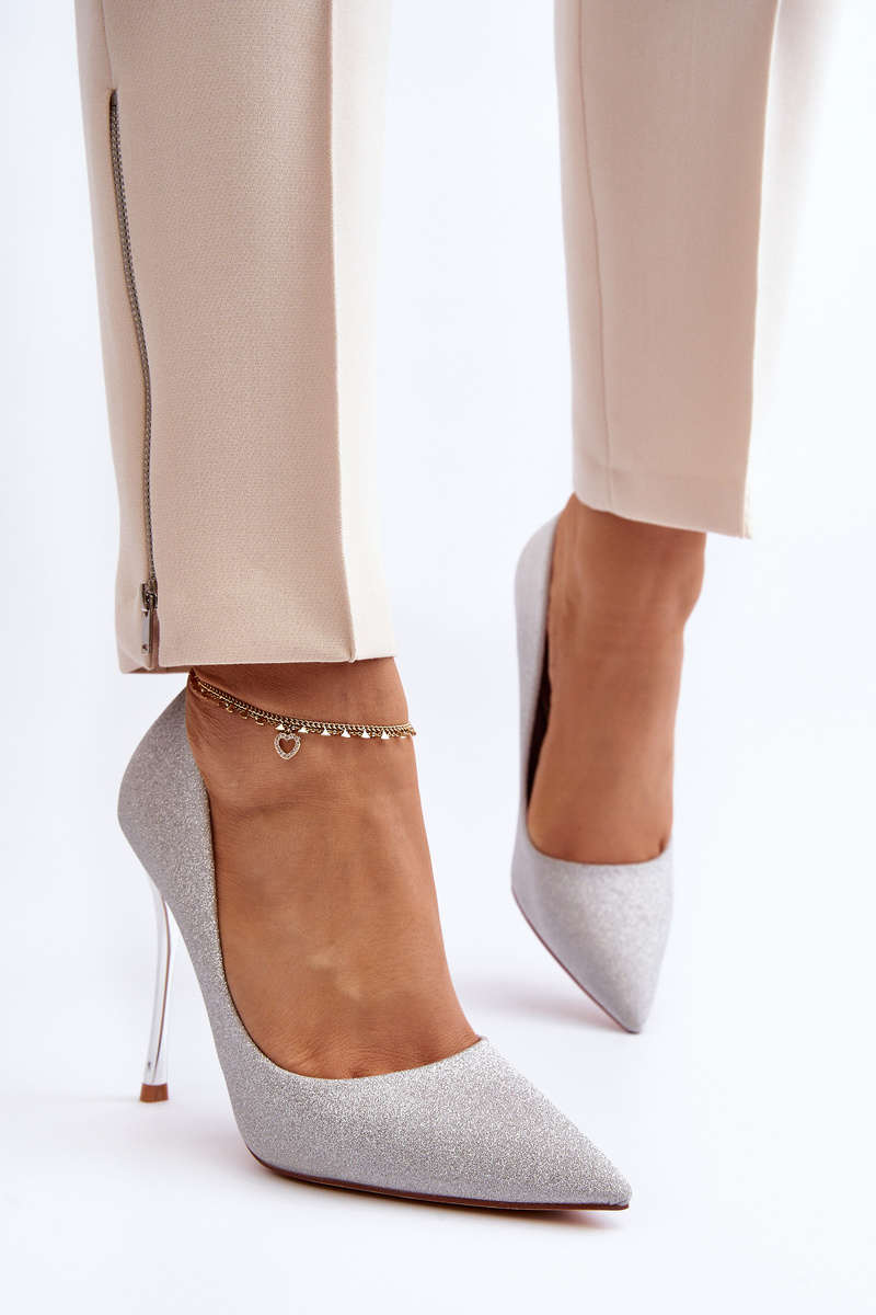 High heels are a classic in women's wardrobe, indispensable in many styles. This model is decorated with sequins. The soft, eco-leather insole will provide comfort during use. Pointed toes visually elongate the legs. Perfect for evening outings! They go great with both dresses and stylish trousers. You definitely should have them! When choosing a size, please refer to the size chart.