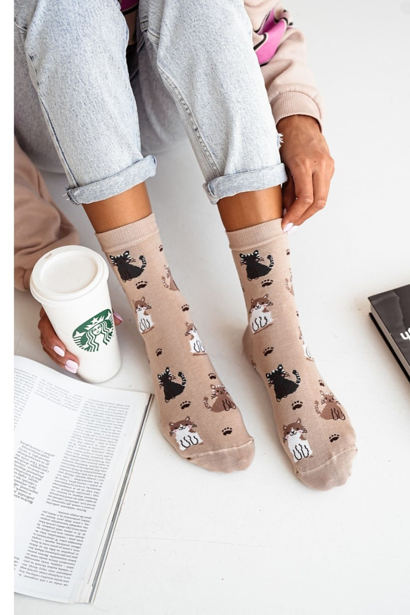 Skarpetki Damskie Bawełniane W Koty Beżowe