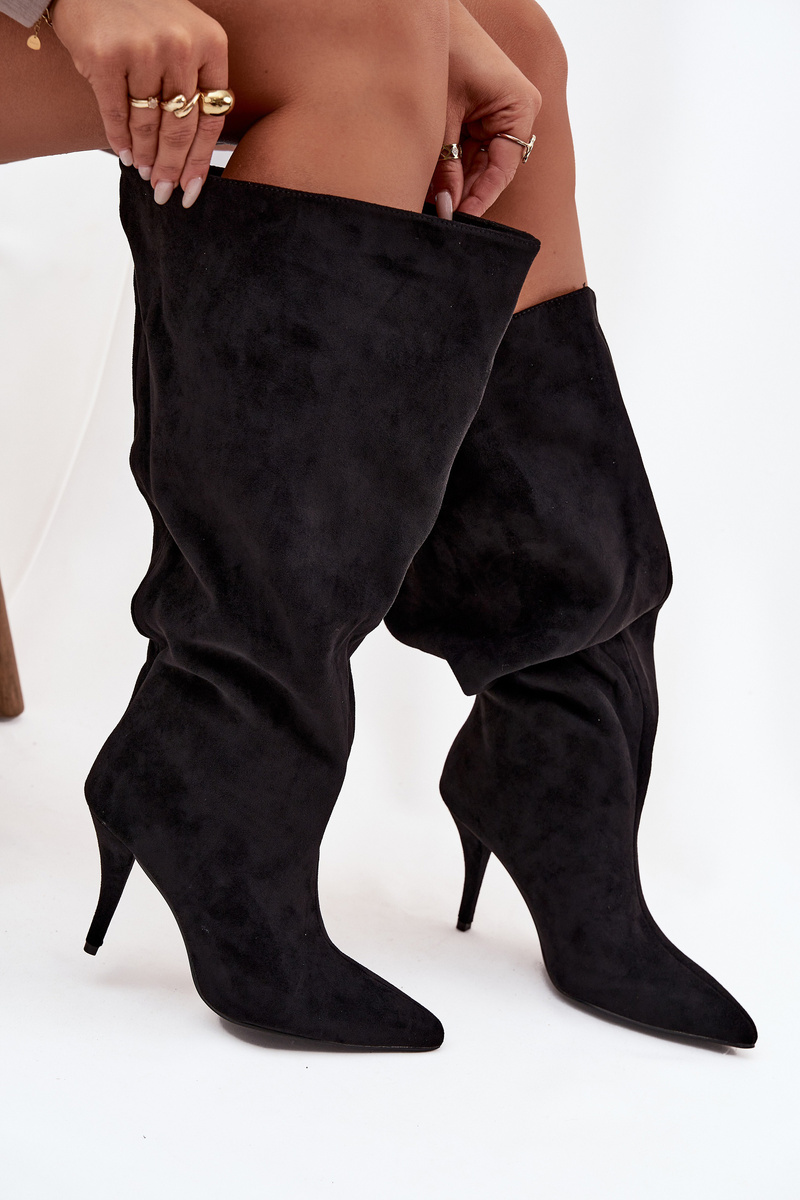 Stylish women's boots made from soft eco-suede are an excellent choice for cooler days. The loose shaft gives them a relaxed, fashionable character, and the seam running along the front subtly slims the leg and adds elegance to the overall look. The model features a slim stiletto heel that beautifully accentuates the silhouette and a pointed toe. They pair perfectly with dresses and skirts as well as tight skinny jeans, creating feminine and stylish outfits. Choose these boots if you value a combination of style and elegance! Please refer to the size chart when selecting your size. When choosing a size, please refer to the size chart.