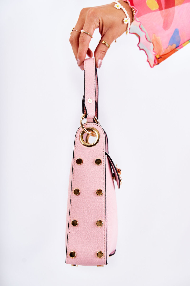 A small women's handbag made of eco leather. It has a non-detachable, non-adjustable handle. The compartment is closed with a flap with a latch. On the front there is a decorative emblem in the form of an insect. Decorative studs are placed on the sides of the bag. Additionally, the bag comes with an adjustable, detachable strap with a chain. This bag is the hit of the season, so don't wait any longer and buy it today! Check also the other models of bags available in our offer!