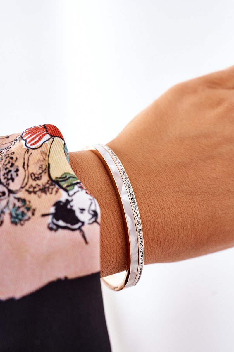 The bracelet is made of stainless steel, decorated with sparkling cubic zirconia and stones with a pearl finish.