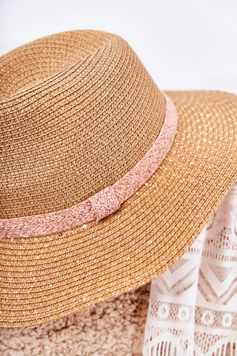 A light women's hat with sequins. The hat is made of woven paper. The brim is decorated with a pink stripe. Inside there is a string that allows you to adjust the hat. Be sure to check out our entire collection of hats! Composition: 82% paper, 12% polyester, 6% metallized fiber.