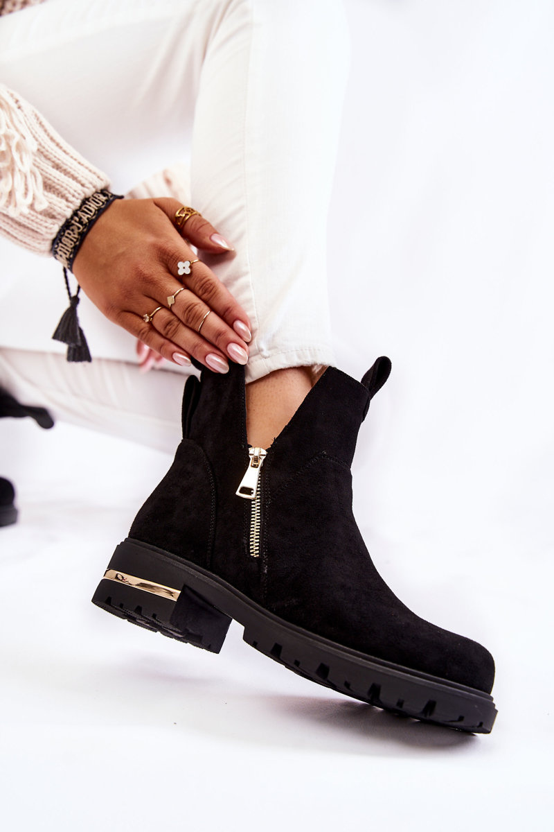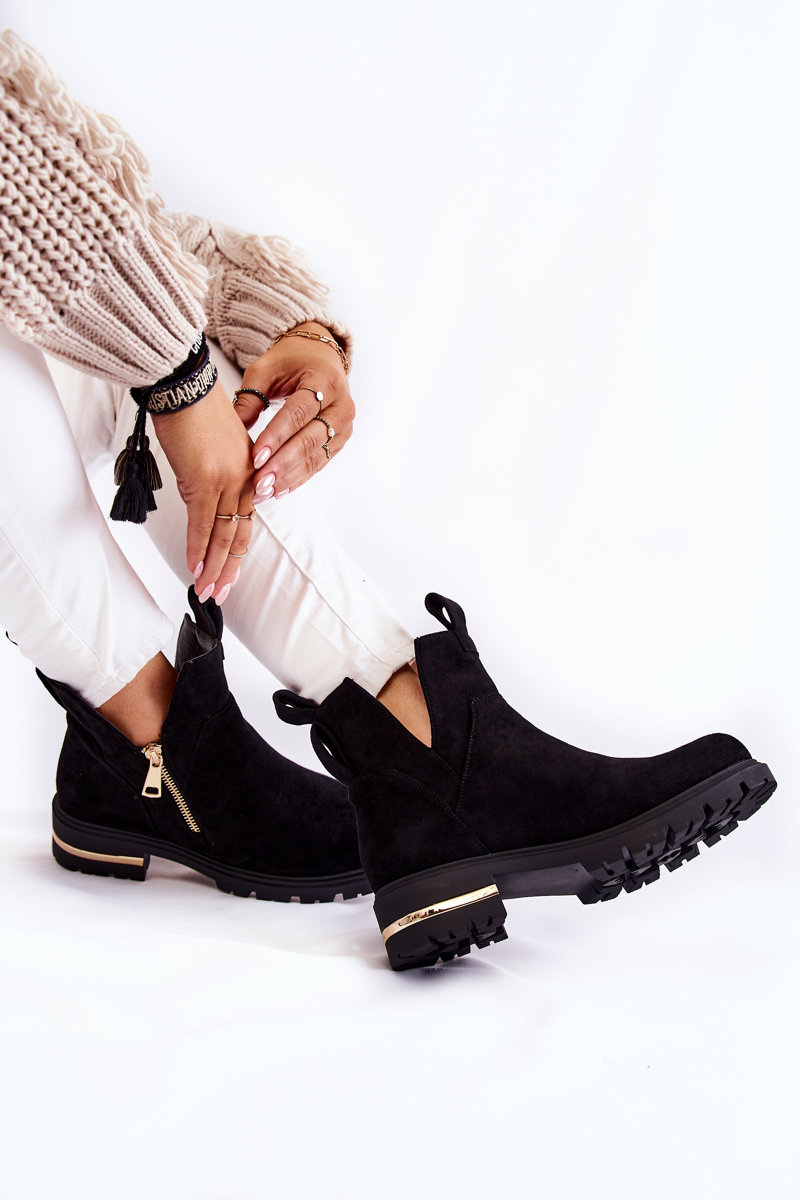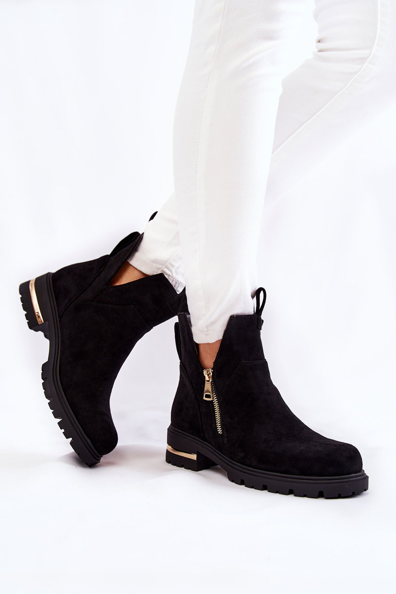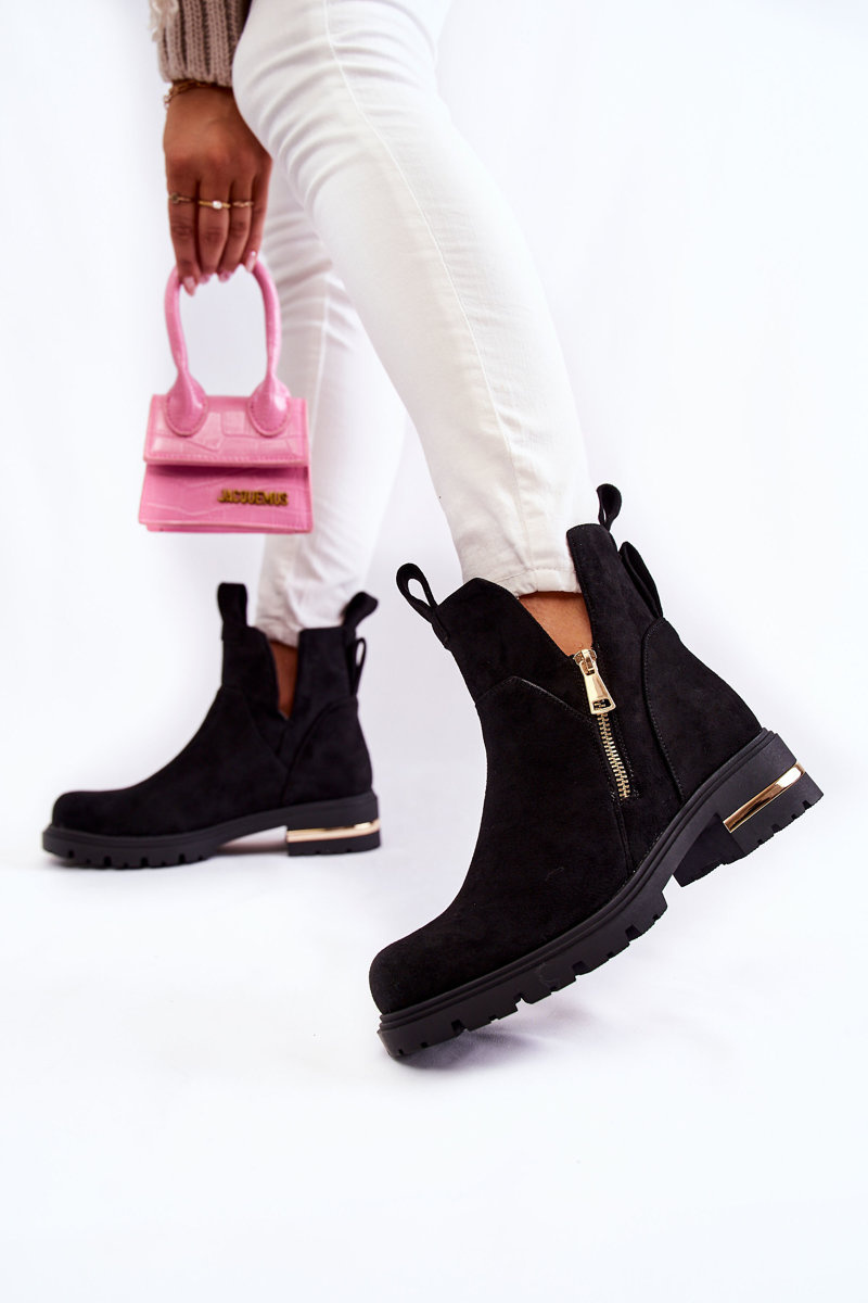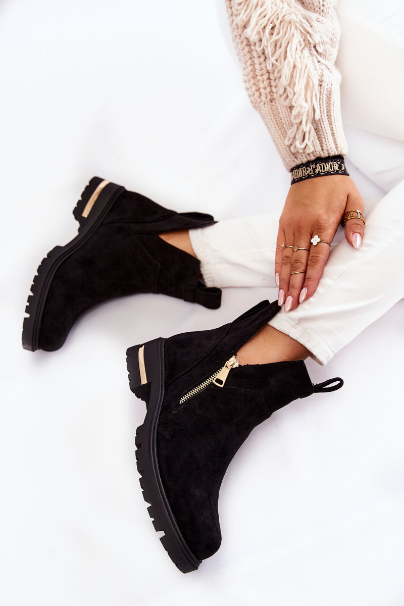 Boots in the style of Chelsea boots have an irregular upper with cutouts on the sides. Made of ecological chamois leather. They have a zipper on the side of the upper and a stiffened heel. Set on a mirror-decorated flat heel with a tread. This model will fit perfectly into the fall trends! When choosing a size, please use the size chart.