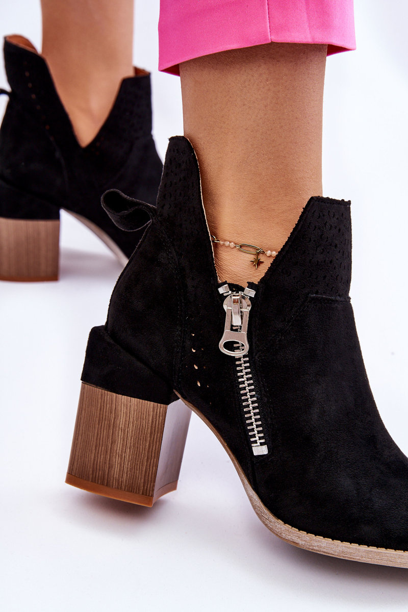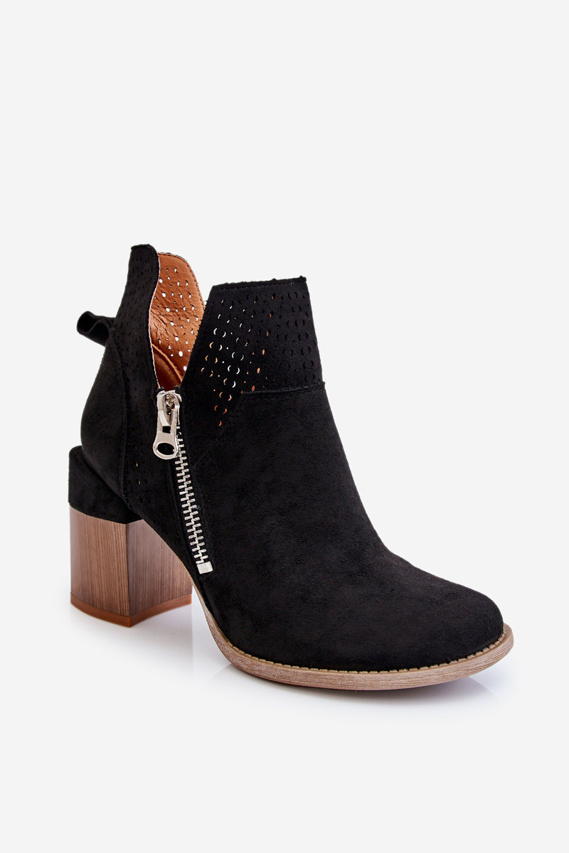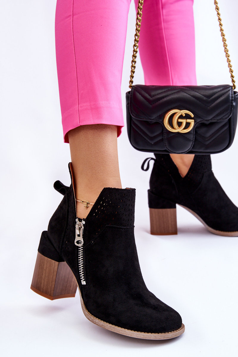 Fashionable boots with a massive heel in the form of a block are made of eco suede with cutouts on the sides of the upper. In addition, they were decorated with an openwork pattern. This model has an additional zipper on the side of the upper. The heel counter in these boots is stiffened. The soft and comfortable insole is made of eco leather. You should have this model in your wardrobe! When choosing a size, please refer to the size chart.