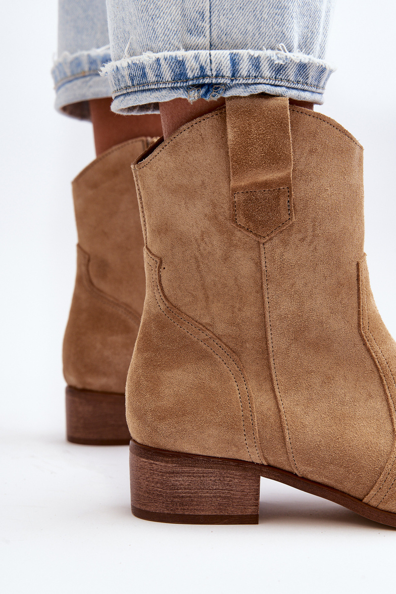 Women's cowboy-style boots, made of natural suede. Low heel. Ankle-high shaft. Pointed toes visually slim the legs. The model fastens with a side zipper. Don't wait any longer and buy them today! When choosing a size, please refer to the size chart.