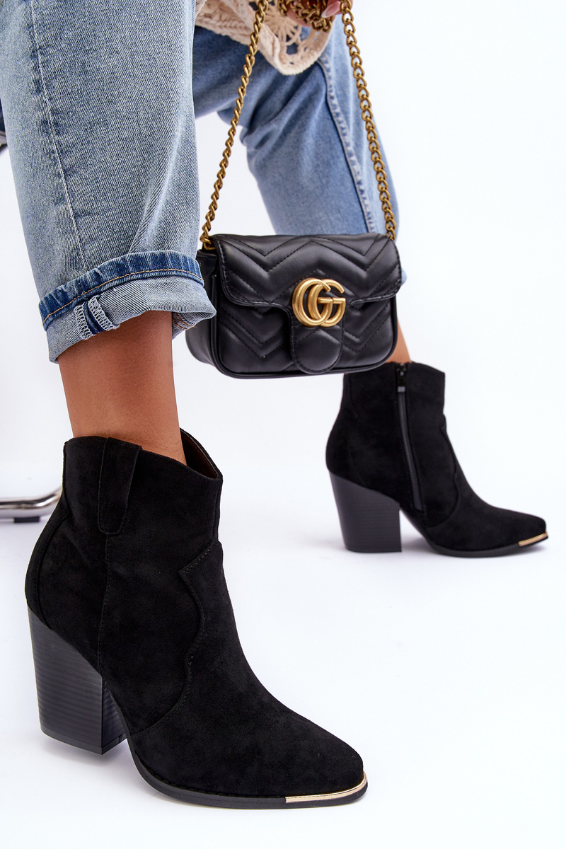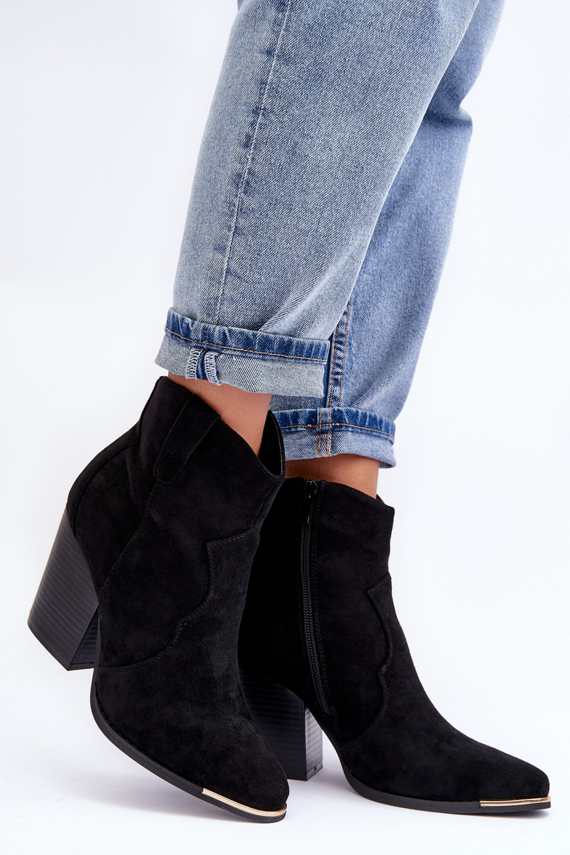 Cowboy-style boots set on a massive heel. The inside is insulated with a shoe blanket. Pointed toes will optically slim the legs. The model is fastened with a zipper on the inside of the upper. When choosing a size, please refer to the size chart.