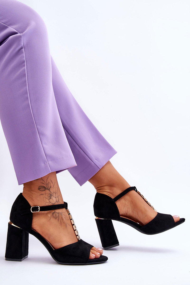 Classic women's sandals are made of eco suede. This model has been decorated with sparkling rhinestones imitating zircons. The sandals have a stiffened heel counter and an eco-leather, soft insole. This model has been set on a heel in the form of a post and is fastened with an adjustable strap with a buckle. When choosing a size, please refer to the size chart.