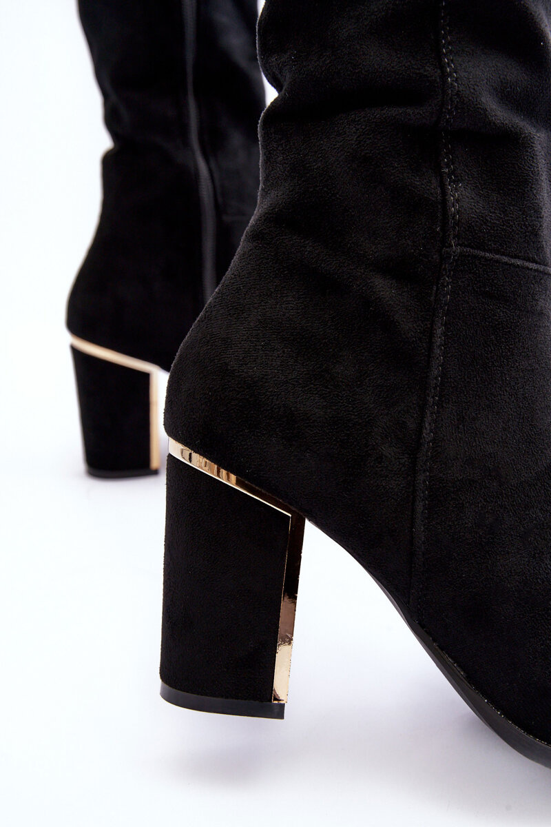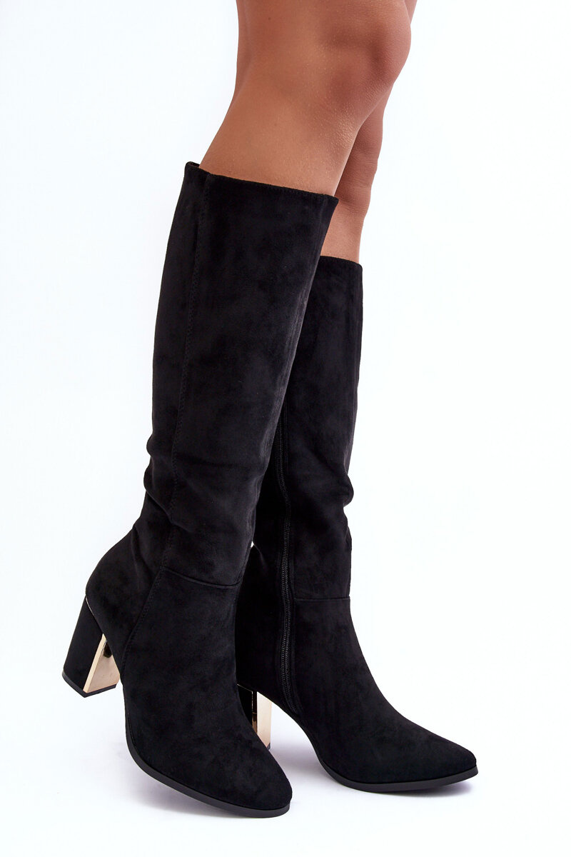 Knee-high boots made of eco suede. Set on a stiletto heel with a golden, mirror element. Zip-up model. Lined with shoe lining for warmth. Additionally, the toe box in this shoe has been reinforced. Soft insole ensures comfortable wear. This model will work great in many looks! When choosing a size, please refer to the size chart.