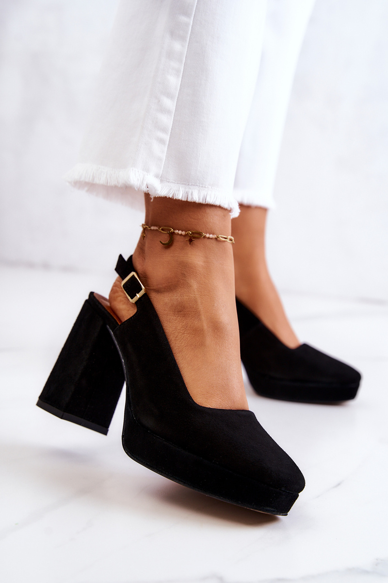 Beautiful Maciejka pumps with an open heel! Made of pleasant to the touch, natural suede. They have an adjustable strap fastened with a buckle. Covered toe. The heel in the form of a massive post will ensure stability at every step. A soft, made of natural leather insole is a guarantee of comfort during use. These pumps will be perfect for business meetings or family celebrations. Classic model, made with attention to every detail! When choosing a size, please use the size chart