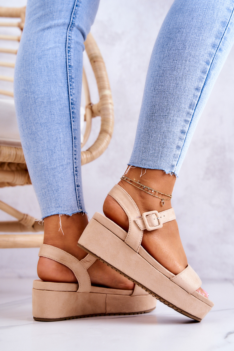 Sandals on a wedge heel and a massive platform will fit perfectly into summer trends! Fastened with a buckle at the ankle height with an adjustable strap. The sandals have straps that support the foot. The sole has grooves and is made of a rubber material. Additionally, it is non-slip. On the outside, the sandals are made of eco-leather suede. These sandals will be perfect for longer skirts or dresses. Eco leather insole will take care of your comfort and convenience. When choosing a size, please use the size chart.