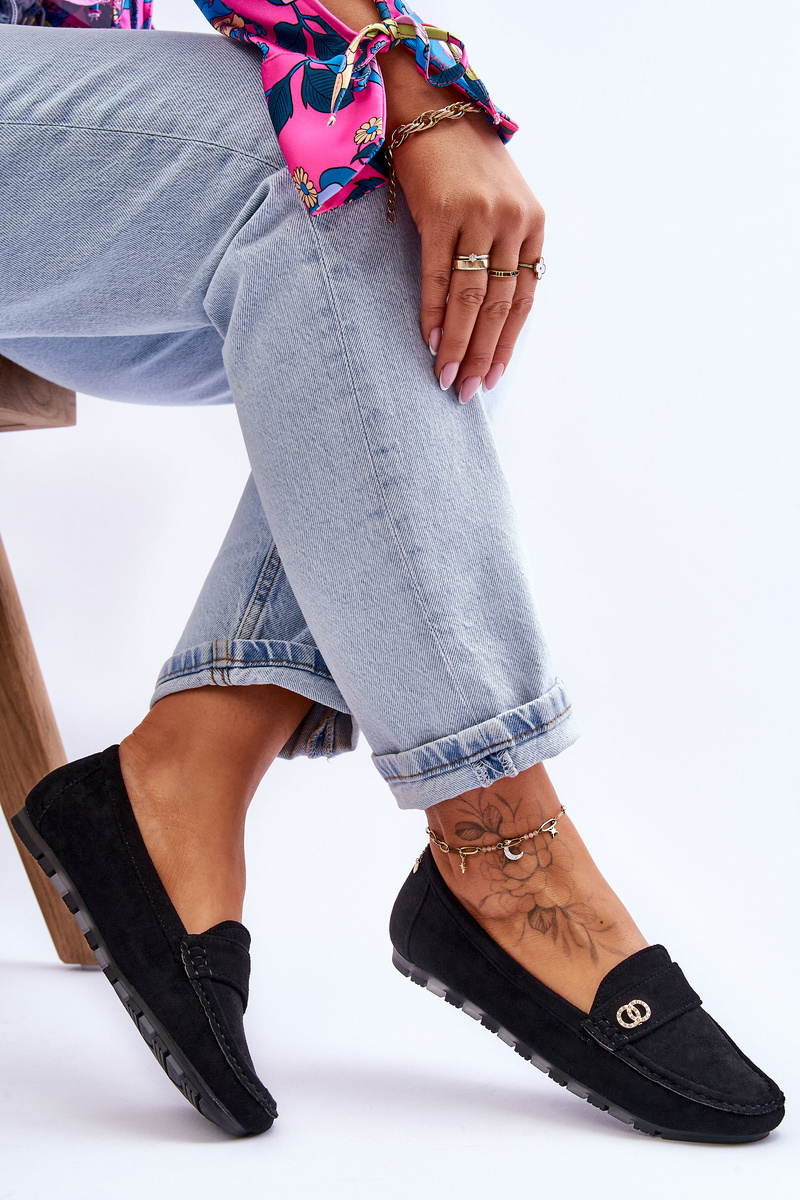 Classic, slip-on loafers are made of eco suede. There is an ornament with rhinestones on the front strap. The moccasins were set on a platform with a rubber, non-slip sole. The soft insole made of eco leather will provide you with comfort during use. A great model for many spring and autumn stylizations! When choosing a size, please refer to the size chart.