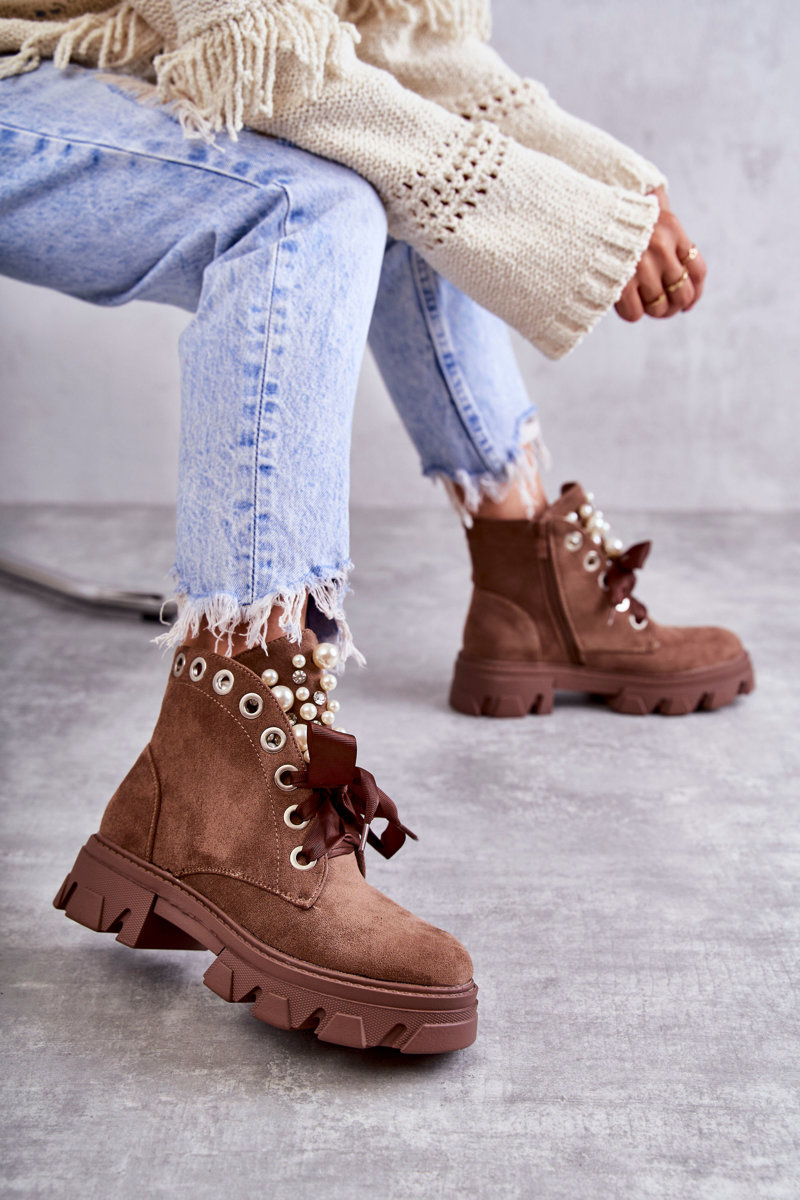 Unique women's boots made of eco suede. The interior is insulated with a footwear blanket that is pleasant to the touch. The model is distinguished by the cut of the upper and elements in the form of pearls and studs. Decorative ribbon perfectly completes the whole. Also fastened with a zipper on the side of the upper. Set on a platform and flat heels. This model must be yours! Don't wait any longer for it to disappear! When choosing a size, please use the size chart.