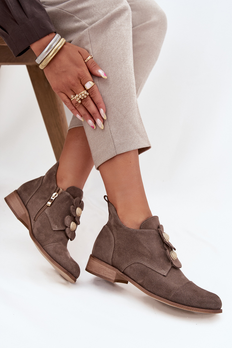Suede Women's Loafers with Decorative Flowers Zazoo 3080 Dark Beige