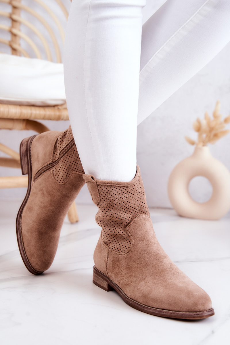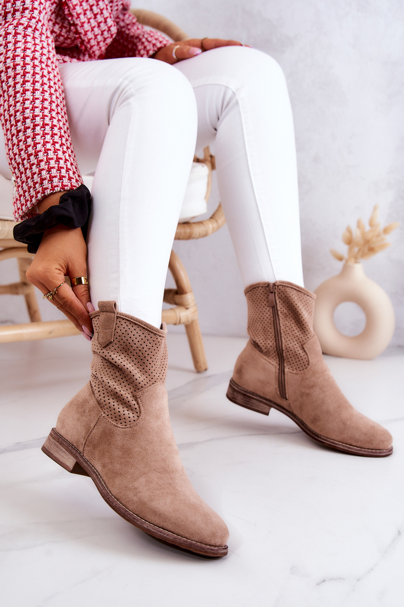 Boots made of eco suede leather pleasant to the touch. They have openwork decorations on the uppers. Fastened with a zipper. A flat heel guarantees comfort during use. They have a soft, eco-leather insole and a non-slip sole. Be sure to check out the other models of boots! When choosing a size, please use the size chart.