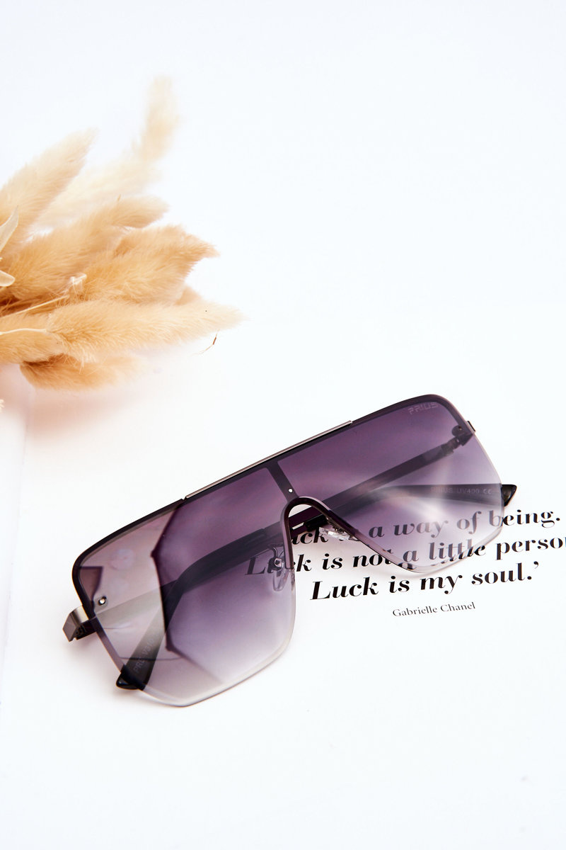 Unique shield style glasses with lenses that connect over the bridge. They have a delicate frame on the upper part. Silicone nose pads. The temples are made of a combination of plastic and metal. Information from the manufacturer: UV 400, category 3, CE certified.
