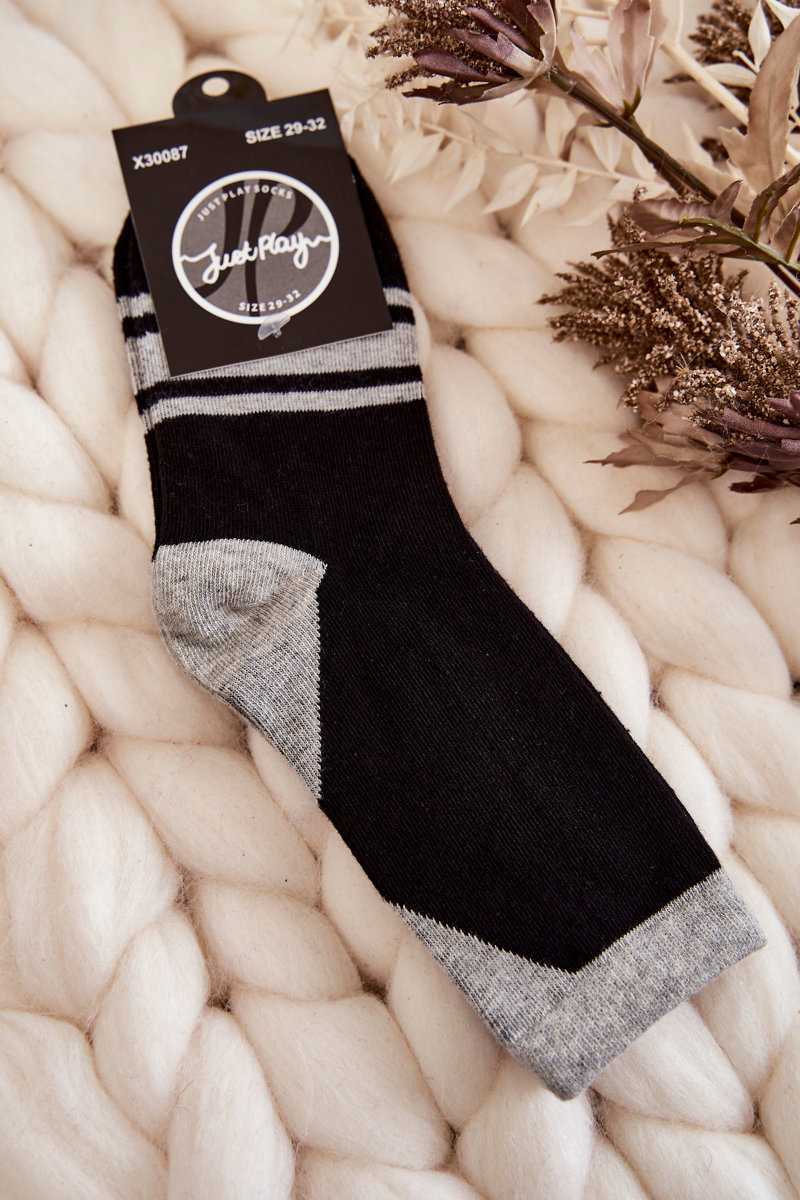 Classic, children's socks with an interesting pattern in the form of stripes of various sizes. Perfect for colder days. Perfect when walking with a child or playing at home. The socks are made of 100% cotton. The elastic welt will adjust to the width of the leg.