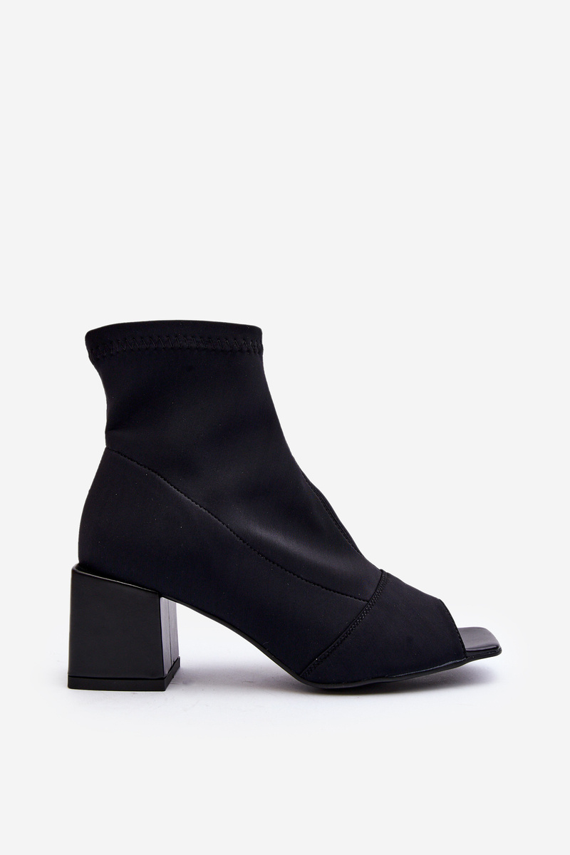 Women's boots made of textile material. Set on a block heel. The ankle-high upper is enriched with stitching. Slip-on model. The insole of natural leather will provide comfort during use. Open toes. You can use this extremely stylish model for many spring stylizations! When choosing a size, please refer to the size chart.