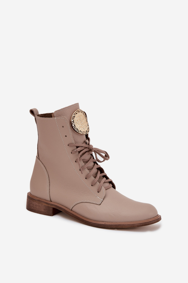 Women's ankle boots made of genuine leather combine classic and modern looks. Set on a flat heel, they provide comfort and stability all day long. The lacing allows for a perfect fit, and an additional zipper makes putting them on easier. A gold detail on the tongue adds an elegant touch. These boots complement various styles, blending comfort with a fashionable accent. When choosing your size, please refer to the size chart. When choosing a size, please refer to the size chart.