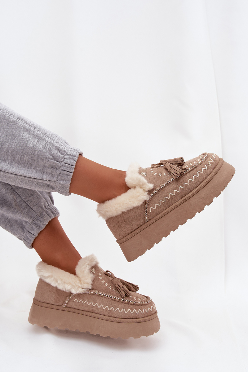 Women's snow boots made from eco suede are a fashionable and functional choice for winter days. The platform sole model provides comfort and excellent insulation from the cold ground. The shoes are decorated with eye-catching stitches, fur lining, and fringes, giving them an original and stylish character. An ideal choice for women who value warmth, comfort, and a fashionable look – perfect for both walks and everyday winter styling. When choosing a size, please refer to the size chart.