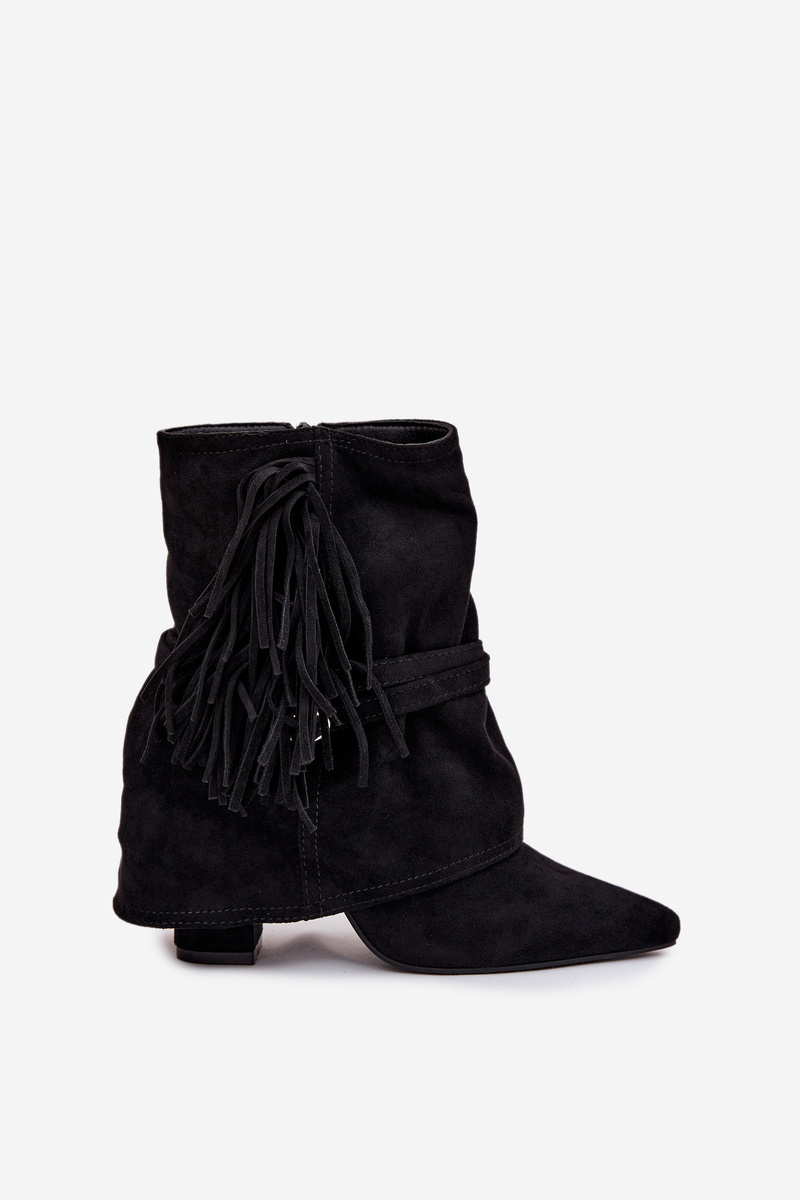 Women's ankle boots made of eco-suede are the perfect combination of style and original details that attract attention. The shaft overlapping the heel subtly elongates the silhouette, and pointed toes add elegance and a feminine character. The model is decorated with fringes and thin straps with gold buckles, introducing a fashion accent and giving a unique, modern look. The boots are perfect for casual outfits as well as more formal styles, adding a touch of originality and chic. Comfortable and eye-catching, they are an excellent choice for everyday wear and special occasions. Please refer to the size chart when choosing your size. When choosing a size, please refer to the size chart.