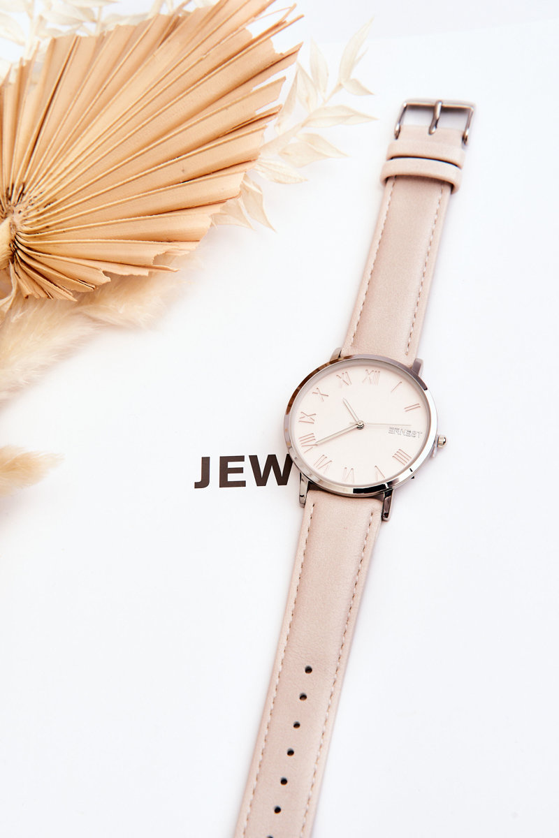 Classic women's watch with a large, visible dial with Roman numerals. Dial in the shade of the watch strap. The watch is fastened with an adjustable strap with a buckle. Nickel-free. The case is made of stainless steel and the strap is made of eco leather.