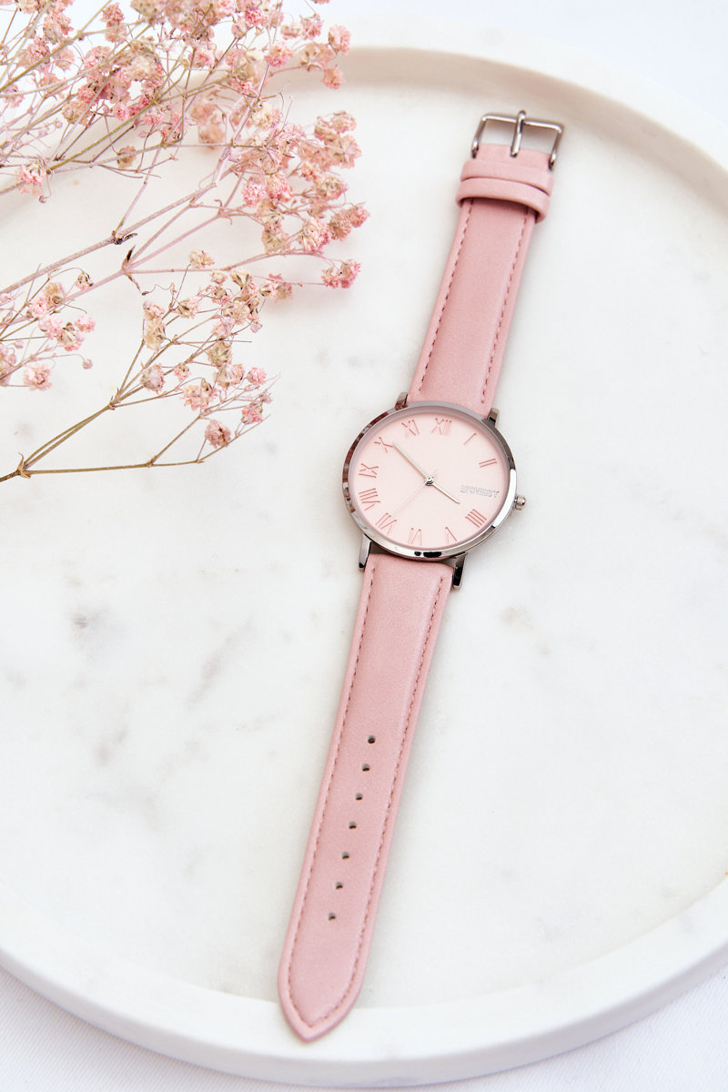 Classic women's watch with a large, visible dial with Roman numerals. Dial in the shade of the watch strap. The watch is fastened with an adjustable strap with a buckle. Nickel-free. The case is made of stainless steel and the strap is made of eco leather.