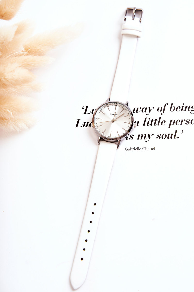 The Ernest watch is a model for every woman who appreciates elegant and fashionable accessories. The watch has an adjustable strap made of ecological leather. Fastened with a buckle. The dial is in the same color as the watch strap. Made of stainless steel. It does not contain nickel.