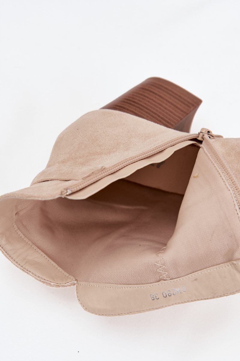 Women's ankle boots made from eco suede. The classic design with rounded toes is enhanced with a frayed strap, giving the shoes originality. The model, set on a stable wedge heel, beautifully elongates the silhouette while providing comfort for everyday wear. The practical zipper closure makes putting on and taking off easy, making the boots user-friendly. These shoes are perfect for the autumn-winter season, serving as a stylish complement to both casual and more elegant outfits. When choosing a size, please refer to the size chart.