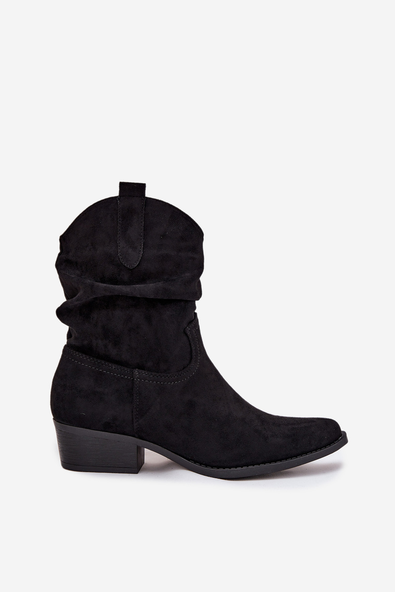 Women's ankle boots made from eco suede. Set on a low block heel, they provide stability and comfort all day long. Almond-shaped toes add subtlety, and a zipper makes putting them on easy. They feature an original upper with ruching, giving them a unique character. These boots pair perfectly with both casual and more formal outfits. When choosing your size, please refer to the size chart. When choosing a size, please refer to the size chart.
