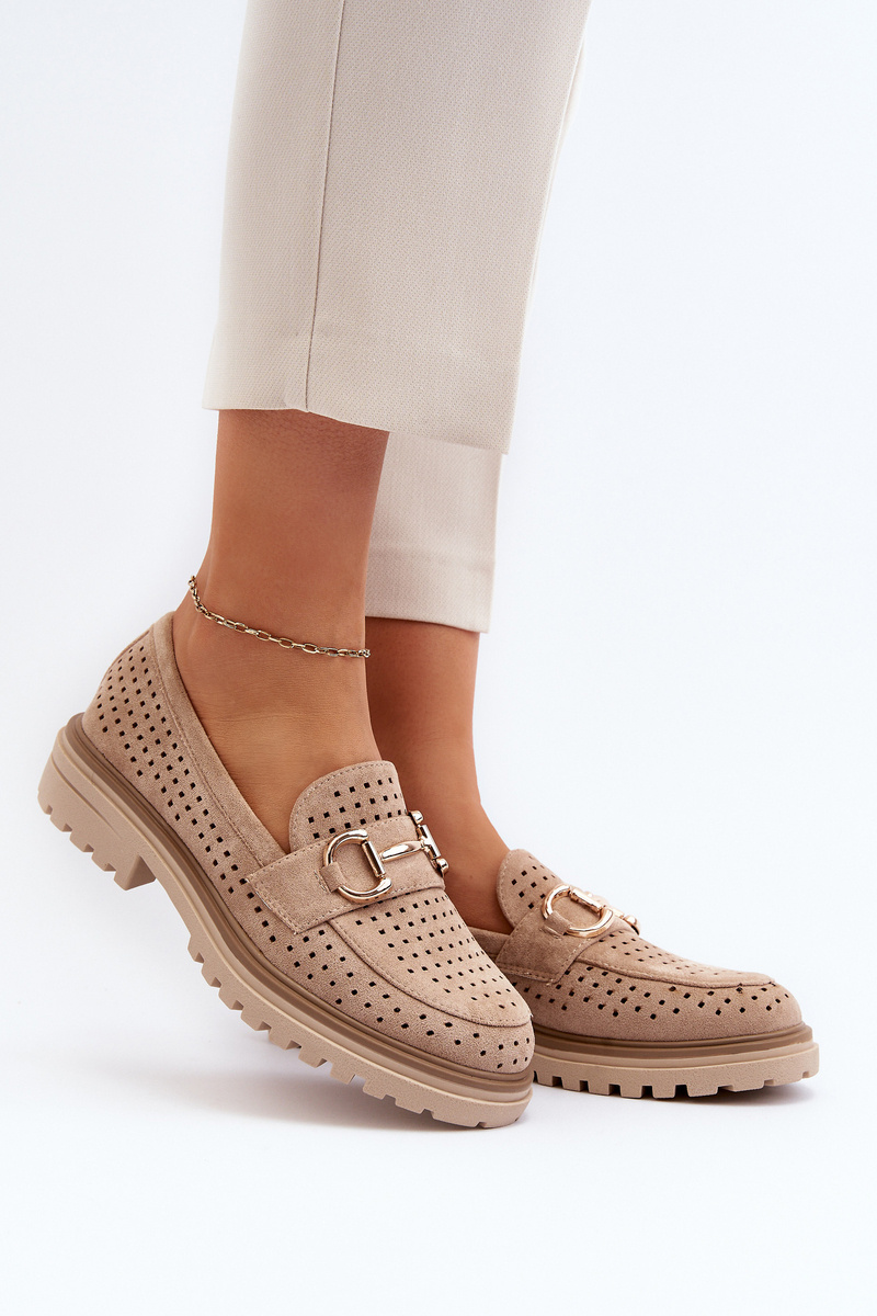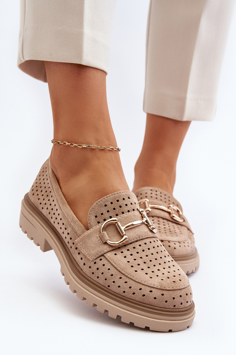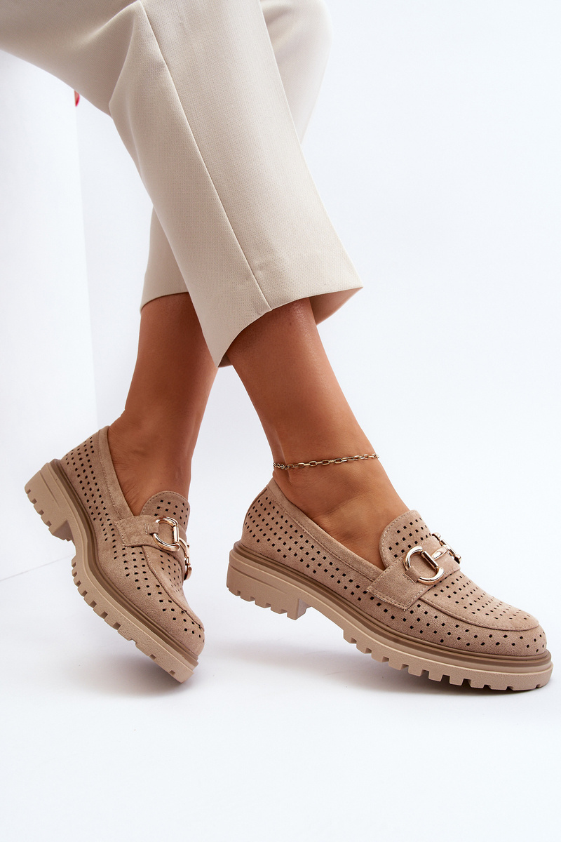 Lace-up women's moccasins made of eco suede look elegant and are an excellent addition to spring-summer stylings. The decoration placed at the front adds charm and elegance. Set on a flat heel and sole made of rubber material. Rounded toes. The eco-leather insole is soft and comfortable. You definitely should have them! When choosing a size, please refer to the size chart.