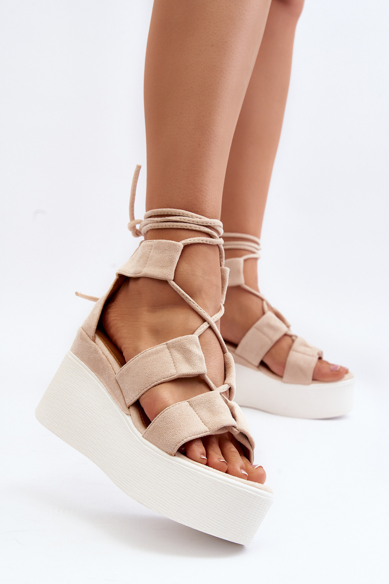 Women's sandals set on a thick platform and wedge. Made of eco suede. This model features a fashionable lacing around the ankle. The lightly profiled insole of eco leather will provide comfort during use. You can match this style with many summer dresses, skirts, and trousers! When choosing a size, please refer to the size chart.