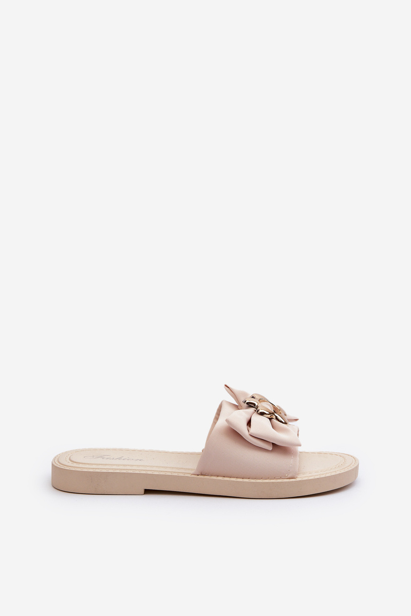 Women's flat heel sandals. The bow placed in the front gives them a girly and charming look. The insole and outsole are made of rubber material. The sandals are comfortable to wear and flexible. Perfect for summer walks, beach trips, or hangouts with friends.