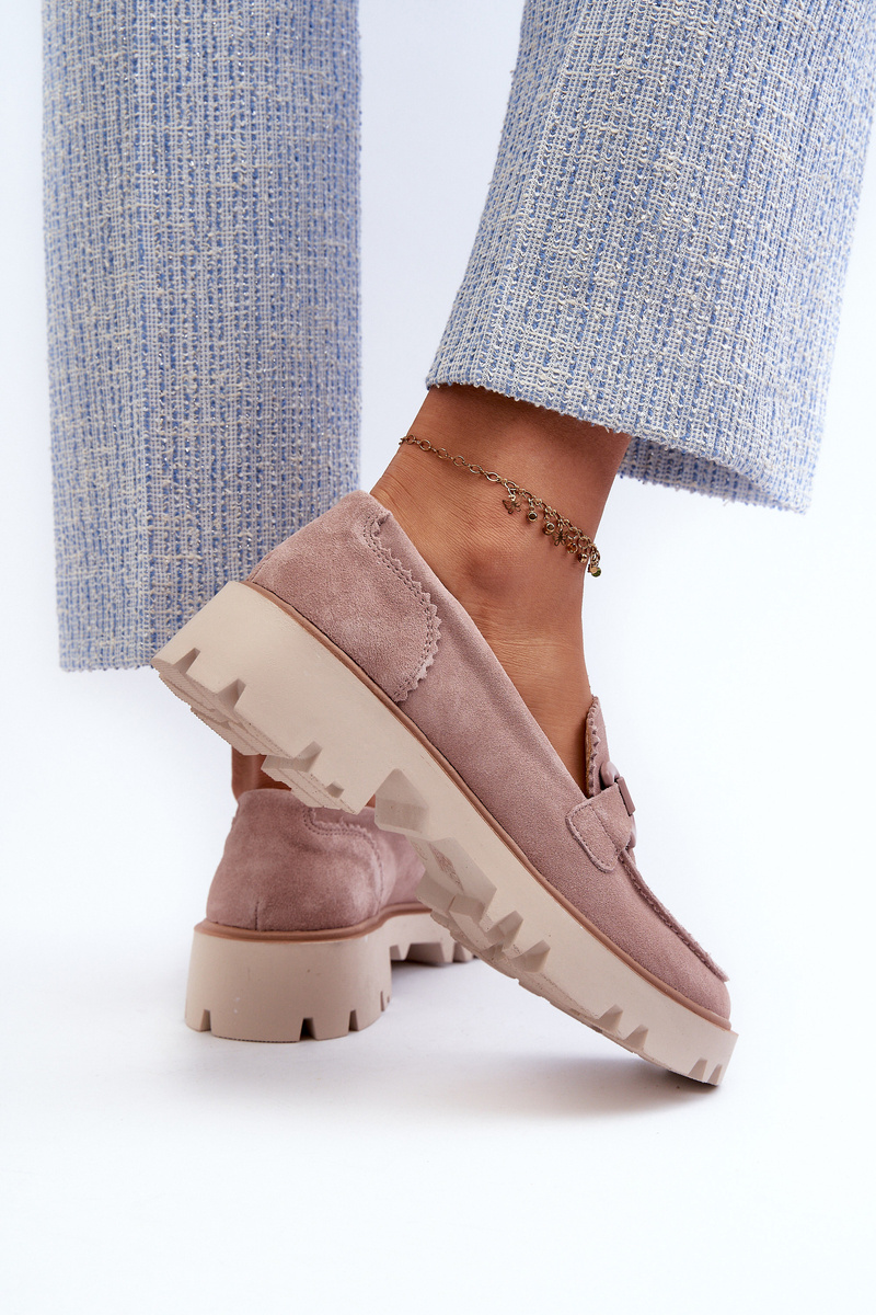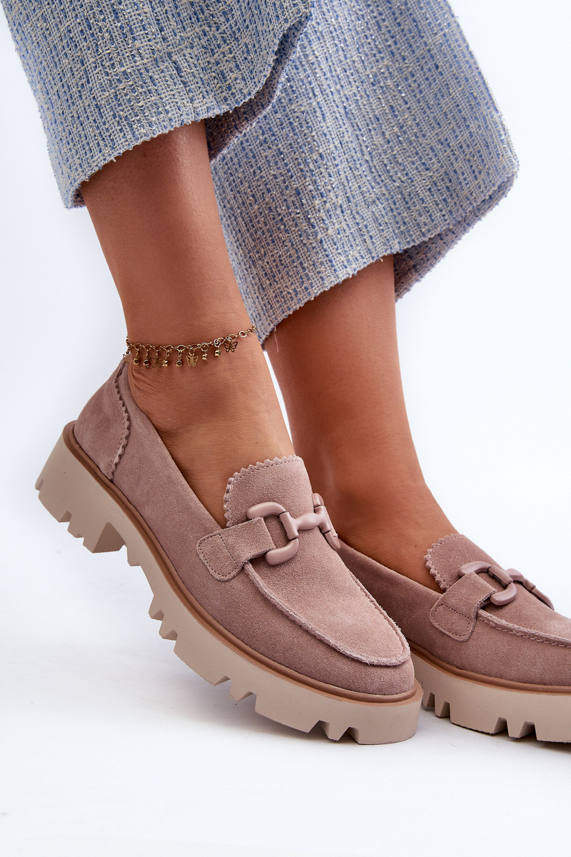 Women's moccasins made of natural suede. Set on a flat heel. The additional decorative element in the front gives them a unique charm, making them an original addition to any outfit. Whether you are going to meet friends or a more formal event, these moccasins will be the perfect complement to your look, adding a touch of subtle elegance. When choosing a size, please refer to the size chart.