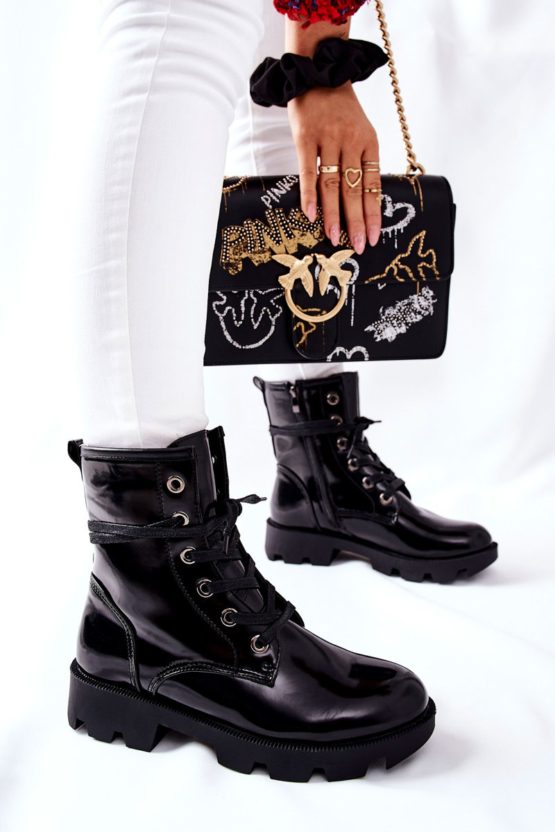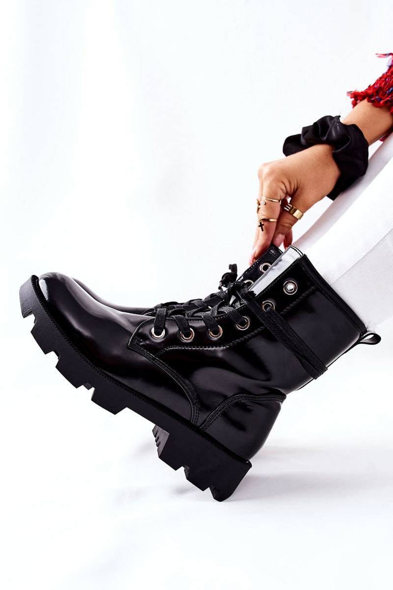 Classic cut with lacing and fastening on the side of the upper. Made of patent ecological leather. When choosing a size, please use the size chart.