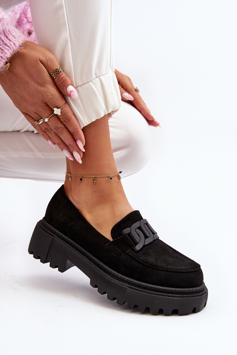 Stylish women's moccasins are an excellent choice for the spring-autumn season. This model is made of eco-suede. The decorative chain adds originality and character. The massive, flat heel and platform will provide stability with every step. These fashionable moccasins are not only comfortable, but also a great addition to many stylizations. Be sure to add them to your shoe collection! When choosing a size, please refer to the size chart.