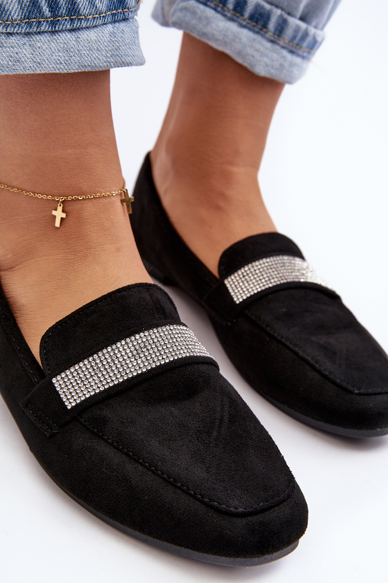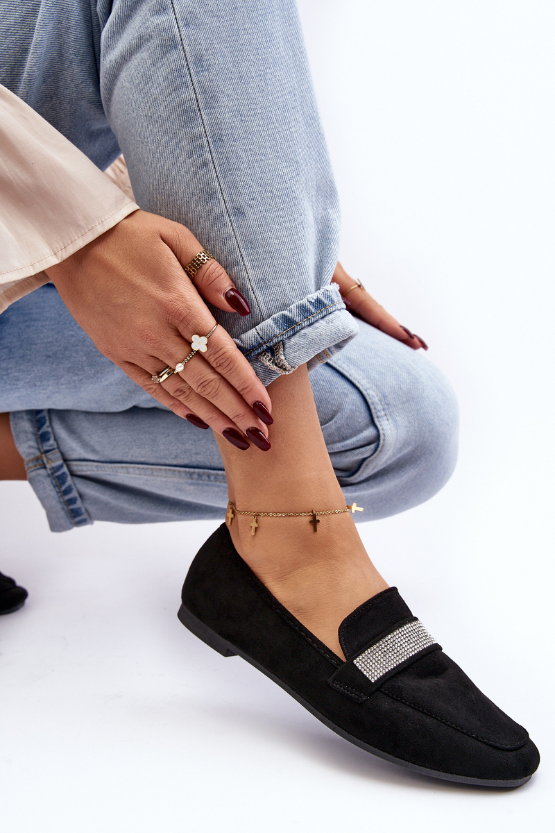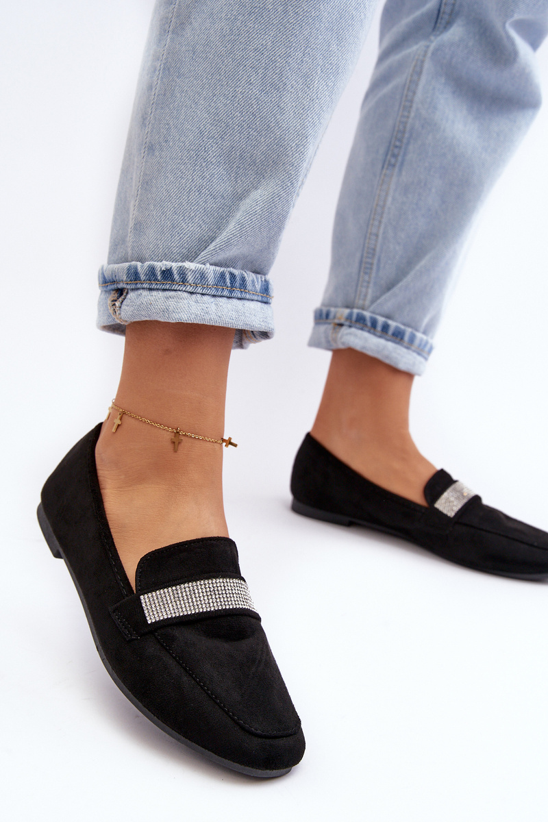 Women's moccasins made of eco suede. Set on a flat heel. Rounded toes. Numerous small zircons on the strap at the front. The soft and contoured insole made of eco leather ensures comfort all day long. Stylish women's moccasins are an essential element of a woman's wardrobe! You must have them! When choosing a size, please refer to the size chart.