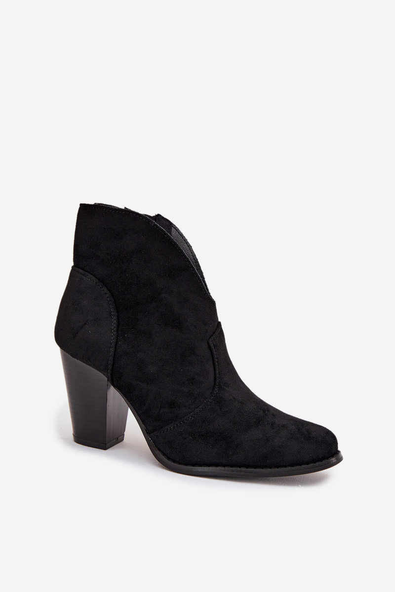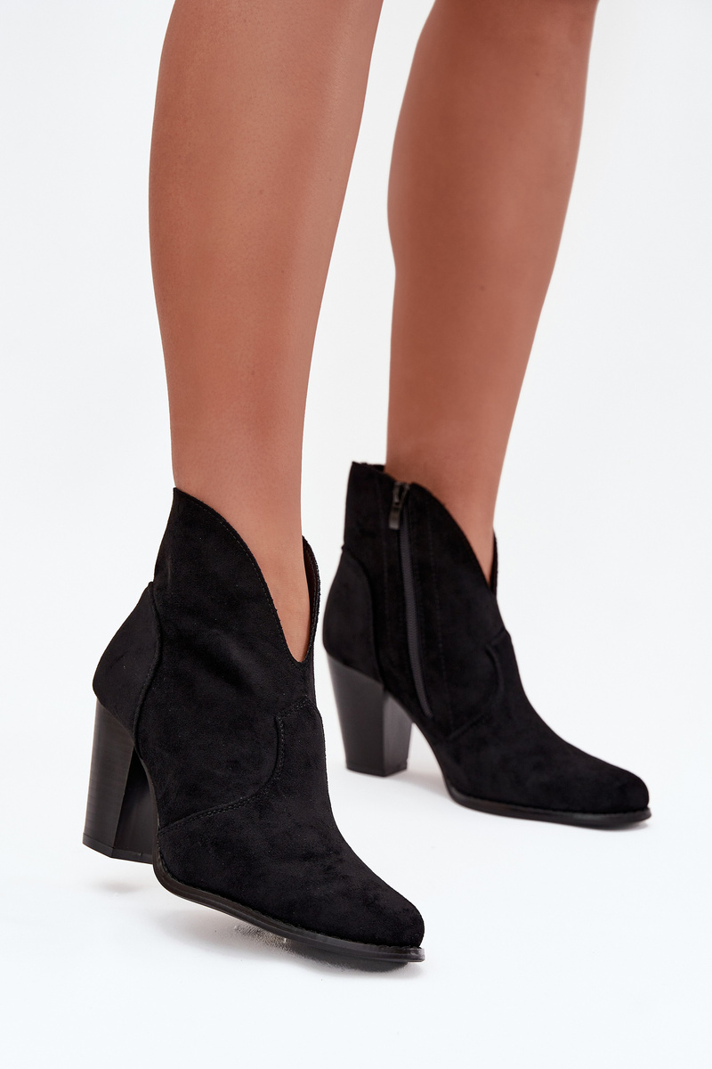 Women's ankle boots made from eco suede. Set on a stable block heel that provides comfort and subtly elongates the silhouette. Almond-shaped toes give them a feminine character, and a practical zipper makes putting on and taking off easier. A versatile model that pairs well with both everyday and more elegant outfits – perfect for pants, dresses, or skirts. Please refer to the size chart when choosing your size. When choosing a size, please refer to the size chart.