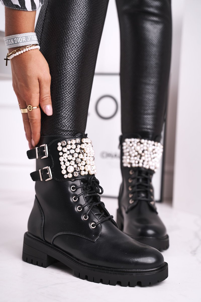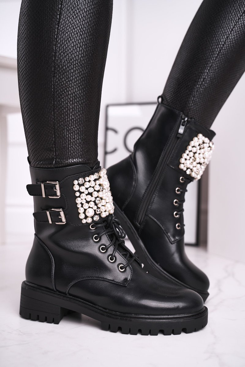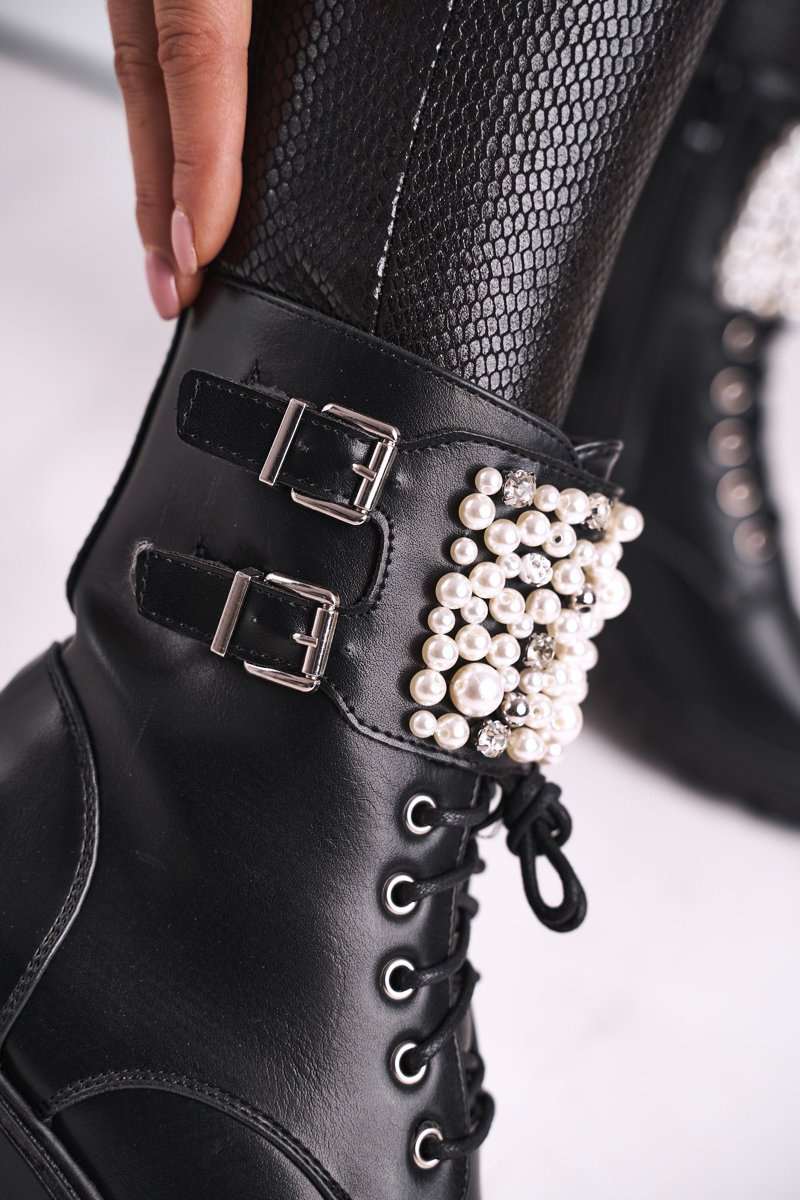 If you've come here, it means that you are looking for fashionable and comfortable footwear for colder days. High shank fastened on the side with a beautiful decoration in the form of pearls and zircons. The possibility of a better fit thanks to the use of laces, which, thanks to the hiding under the flap with pearls, also create a great decoration. The inside is covered with a nice-to-touch footwear blanket. We like to give women a reason to buy a new pair of shoes, and these boots are one of them! When choosing a size, please use the size chart.