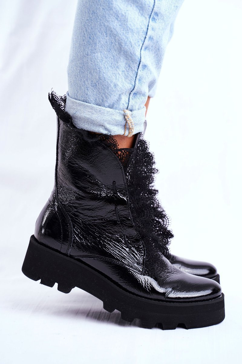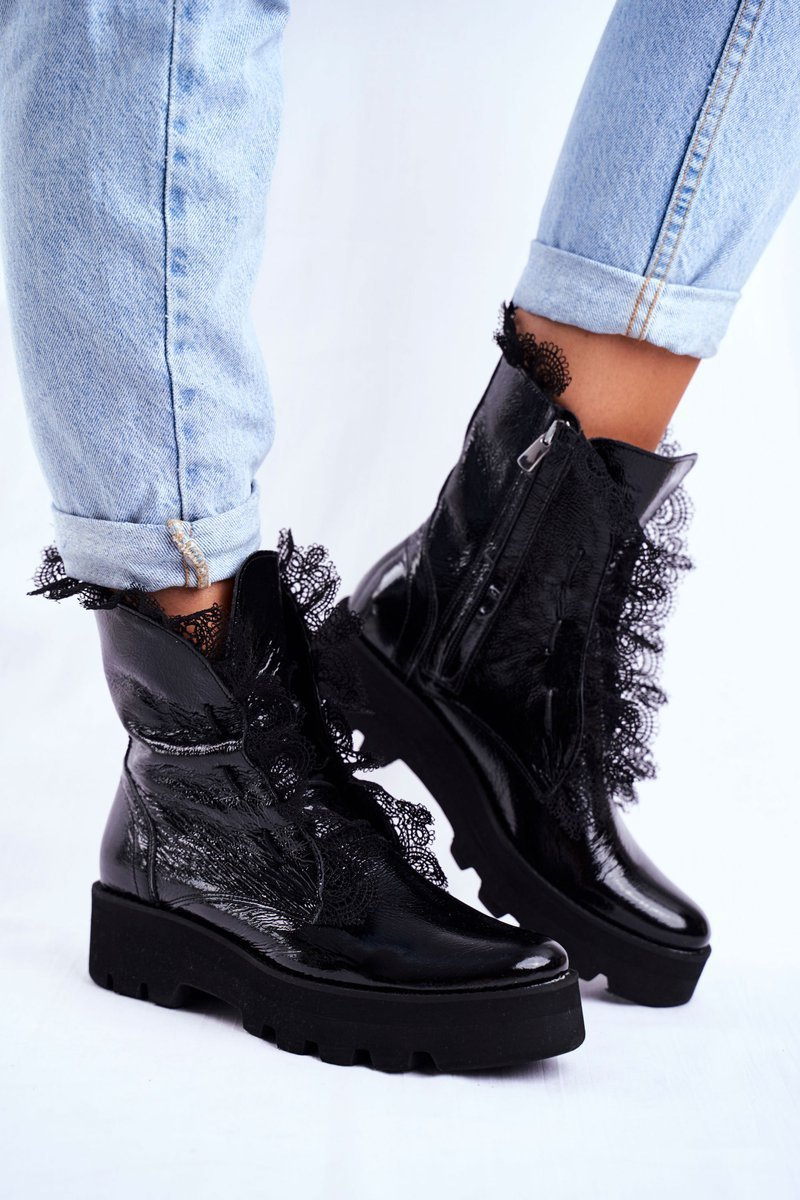 Polish leather boots are something every woman needs. Patent leather with decorative lace around the upper. The natural leather insole will provide adequate comfort of use. The shoe is mounted on a high sole with classic lacing. Don't wait any longer, buy now! When choosing a size, please use the size chart.